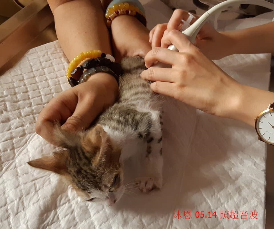 工作人員小心翼翼的呵護大尾,準備適合他年紀的食物及營養品,擔心他身體不舒服吃不夠,每天要多次灌食,大尾因眼傷加上太過年幼,健康情況極不穩定,食慾精神狀況也是起起伏伏,5月4日大尾突然食慾不好、嘔吐,立即帶他至沐恩醫院看診,血檢結果,大尾的腎指數偏高及有貧血現象,因此住院施打靜脈注射,至5月10日精神食慾恢復後出院,須定期回診追蹤腎臟情況, 5月20日早上大尾又發生嘔吐、精神食慾變差,再度至沐恩住院施打靜脈注射、住氧氣室吸氧,醫師告知紅血球指數下降,超音波顯示,雖然腎發炎情況有好轉,但腎臟已受損傷,形狀較不完整,且還有胸骨異常及扁平胸的情況,住院期間還因紅血球指數下滑,醫院於5月27日通知協會大尾須要輸血,協會緊急帶了幾隻貓咪前往配對捐血給大尾,看到大尾小小的身軀居然要承受這麼多的病痛,讓人萬分不捨心疼。