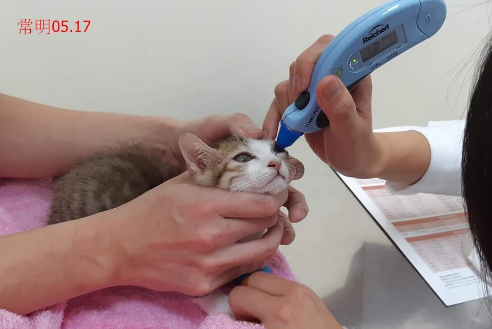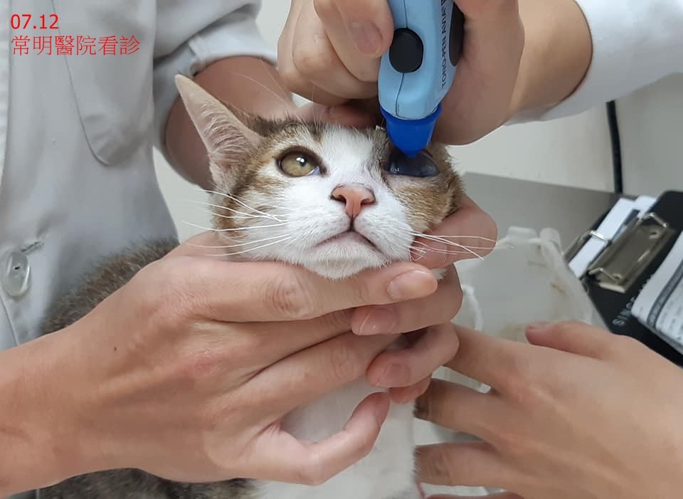 4月12日協會得知眼傷的小奶貓已被送回收容所,立即連絡志工接出,並送往有眼科專科的醫院進行檢查治療,因眼皮跟第三眼瞼沾黏,醫師將沾黏切開,囑咐每天都要點四次共三種眼藥水,眼傷小奶貓到了安養之家還無法與媽媽及手足團聚、須暫時隔離照護觀察。