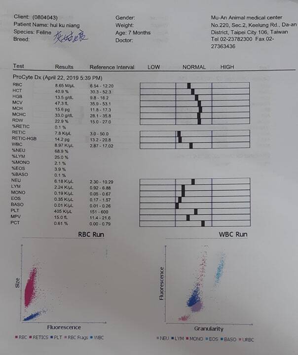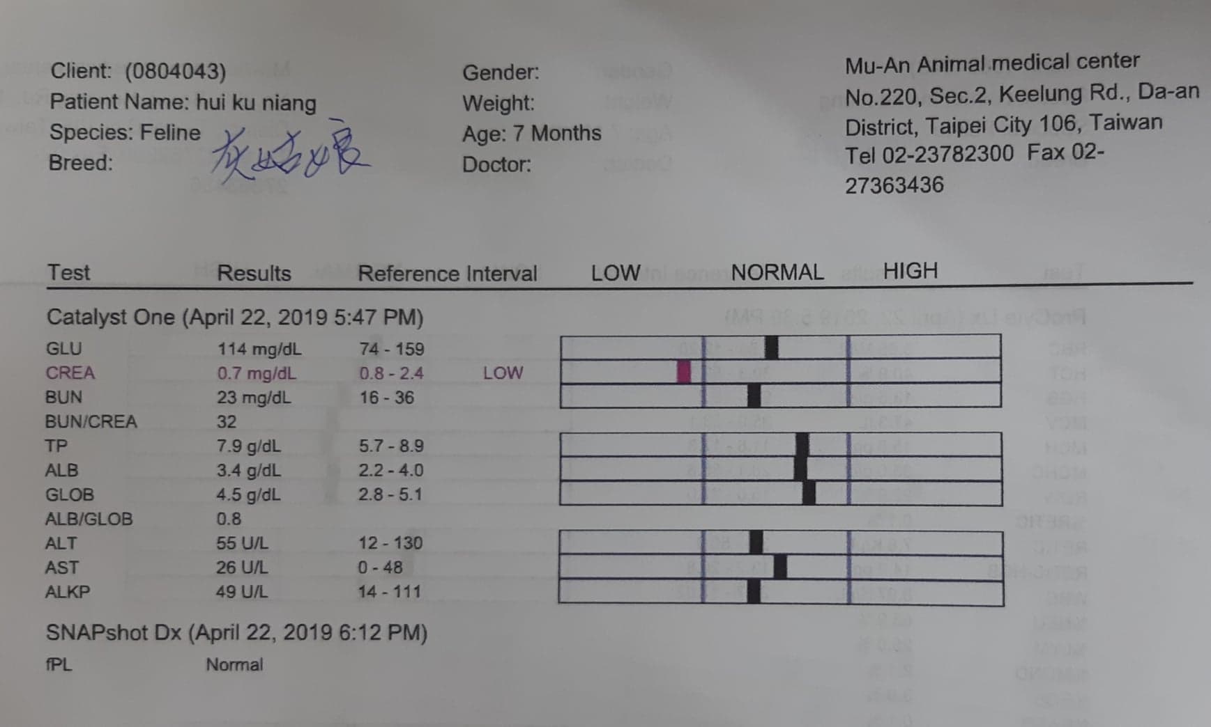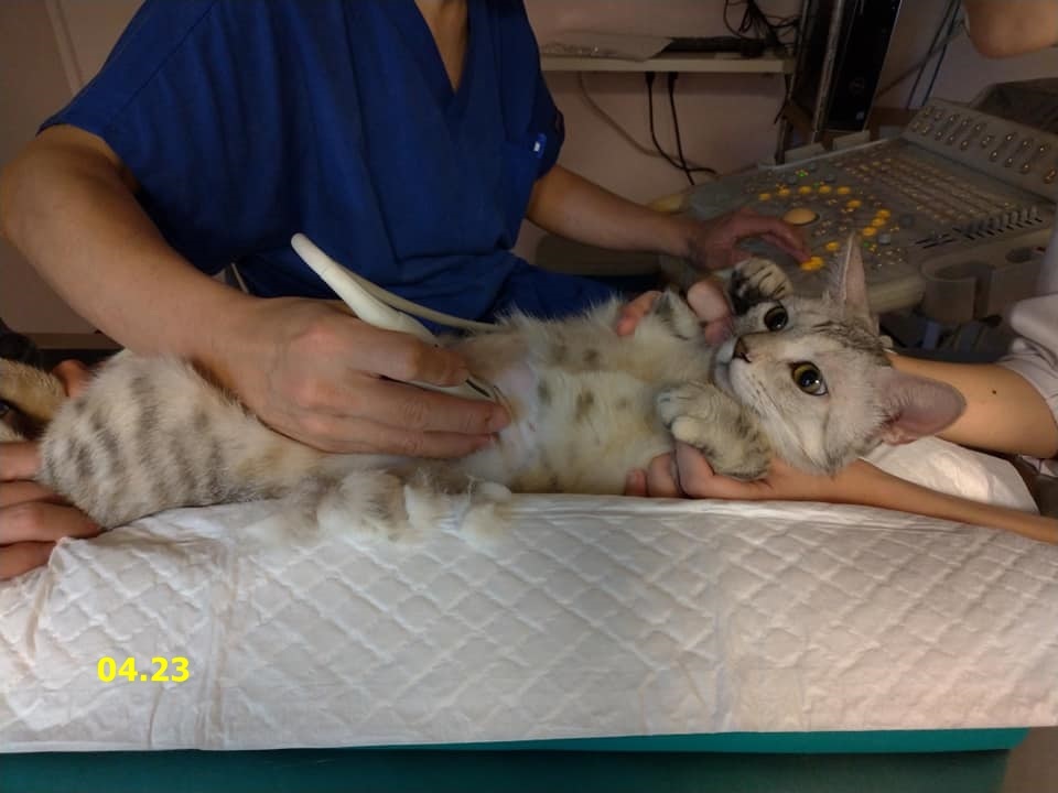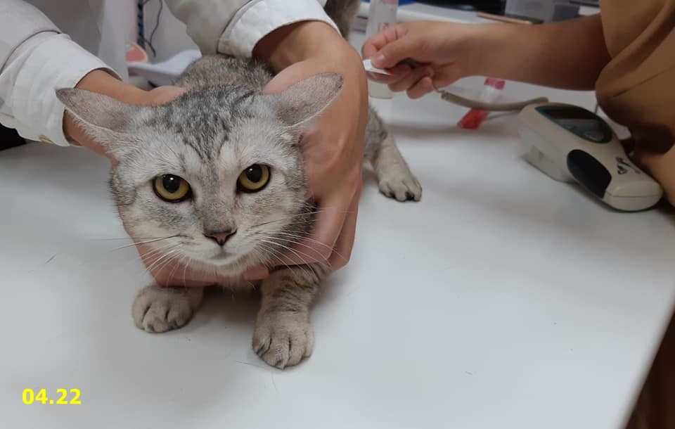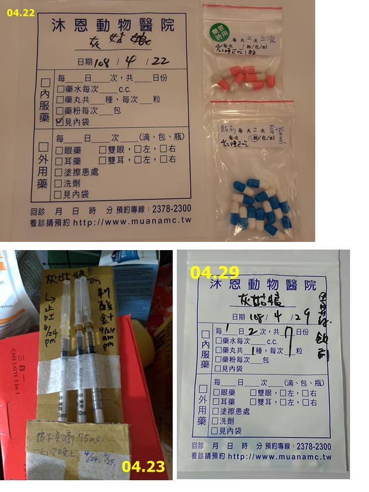 4月22日灰姑娘突然頻繁嘔吐,約診沐恩醫院檢查,血檢無發現異常,並無胰臟炎,X光檢查腸道空氣較多,有輕微脫水現象,因此醫師先為她打皮下輸液,並開藥帶回服用,但翌日灰姑娘又吐得厲害,工作人員趕緊再帶她就醫,超音波檢查與前一日的X光對照,懷疑有吃入異物,且多處淋巴結表示腸胃嚴重發炎,醫師調整用藥改為針劑治療,照護員依照指示幫灰姑娘打針並詳細觀察,一週的回診,灰姑娘嘔吐情況已改善很多,再開新藥吃完即可停。