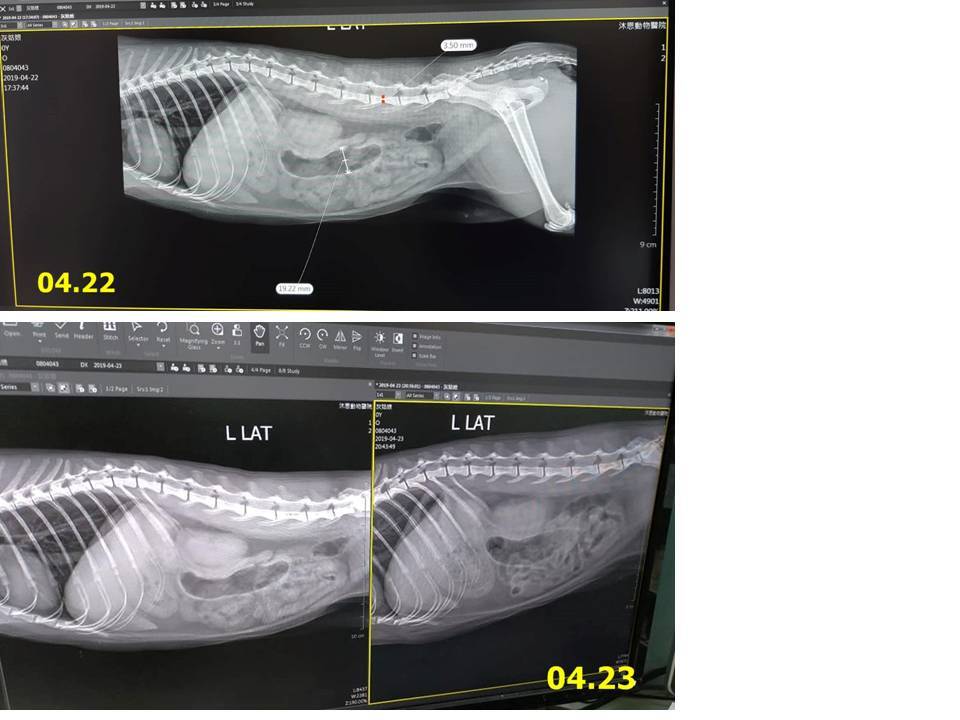 1. X光片跟昨天對照,腸子內的空氣位置跟昨天一樣,沒有移動,懷疑是異物。