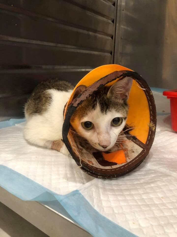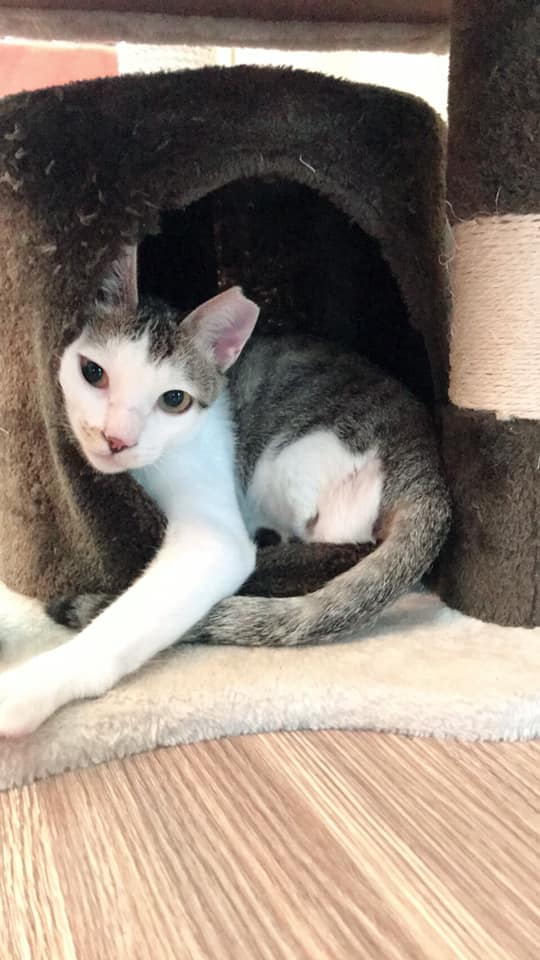 接獲民眾通報在市場附近看到一隻親人的浪貓,靠近一看才發現他其中一支後腳疑似被捕獸鋏夾斷斷了,新竹志工前往救援,順利誘捕送醫。動物近況說明: 出院後轉至中途家休養,考慮蛋餃是截肢貓而且驗出貓白血,後來由一位家中沒有貓咪的愛心小姐認養。