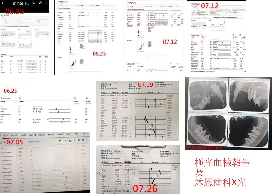 血檢結果,上次升高的肝指數有下降、紅白血球指數都很好,白蛋白降低一點點,可能是小賓今天有吐的原故,但因降幅極小,也不排除是儀器的問題,整體而言,近期血檢是有逐漸進步的。