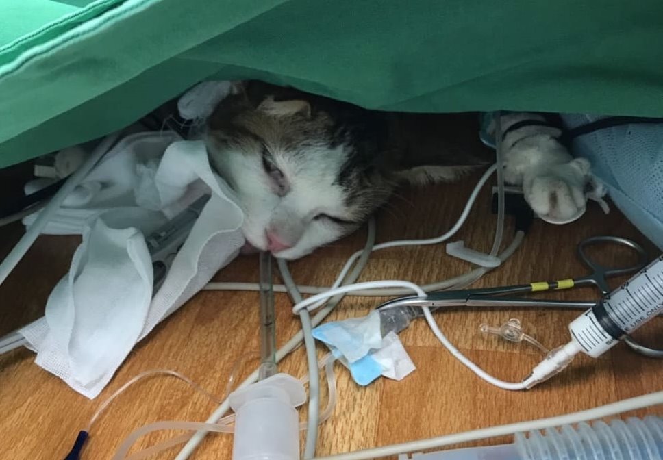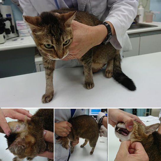 簡小姐在上山餵貓發現一隻浪貓疑似被車撞,右腳因拖行還磨出大傷口,雙腿交叉變形無法直立,X光和觸診後,醫生告知貓咪需要動"腸薦關節復位固定術"跟"單側骨頸切除術",4/15進行手術,靠近腹腔的腸薦骨骼受撞擊位移,但受傷已超過數周內部沾黏嚴重,甚至看不到坐骨神經, 考量周邊血管神經眾多, 硬是拉扯可能造成癱瘓, 故腰間手術無法施行。後遺症是貓咪終身會覺得疼痛, 後半部會壓低身體走路,比較不像正常貓咪直立。