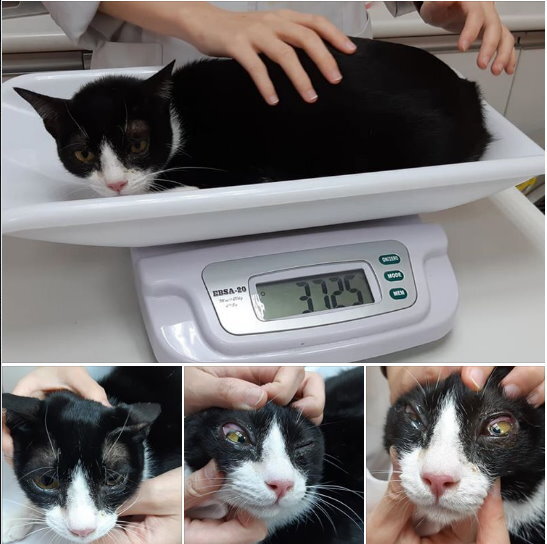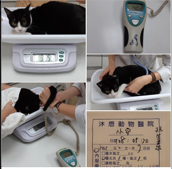 住院期間進行直腸復位、直腸固定、血檢、x光、驅虫、完成結紮,在穩定出院後即住進安養之家;5/24眼睛紅腫就醫,診斷皰疹病毒引起結膜發炎,黃色分泌物為二次細菌感染,無發燒、沒有鼻涕,暫不需口服藥,眼睛以生理食鹽水將內分泌物洗出,再點點必效眼藥水,一週後回診分泌物變多、右鼻孔有清澈鼻涕,發燒40.2度,可能是近日天氣變化影響,先開抗生素,觀察食慾有否降低若症狀沒有緩解仍需回診,還請各位幫忙小安的回診費用。