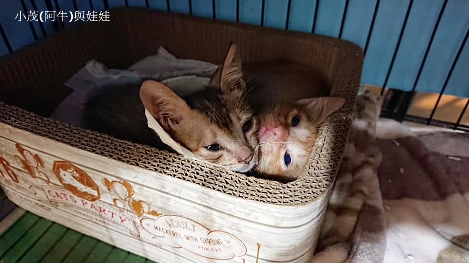 小茂後改名為阿牛,三隻小貓從小就營養不良,照護上煞是費心,擔他們食慾不夠,每日需數次灌食及補充各種營養品,因有小貓常見的皰疹病毒及腸道壞菌多、寄生蟲的問題,經常反覆淚眼、鼻涕、腹瀉,須要時常看診檢查吃藥、每日氣霧治療呼吸道。