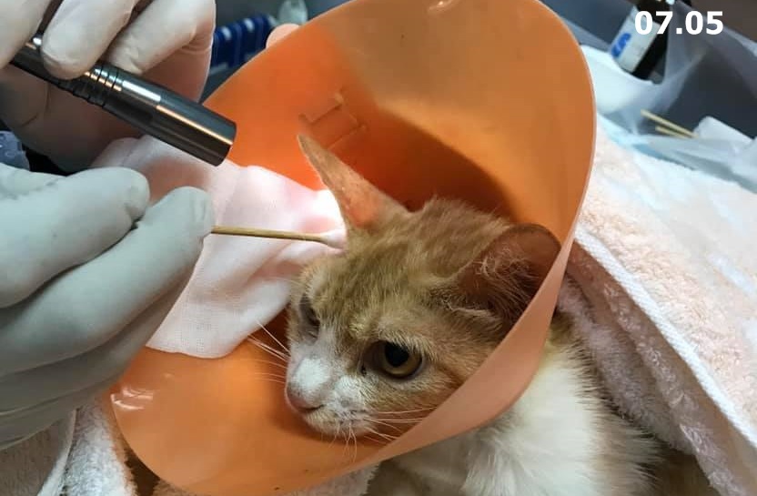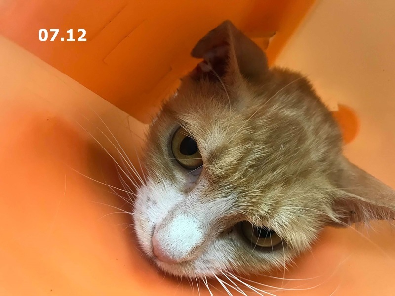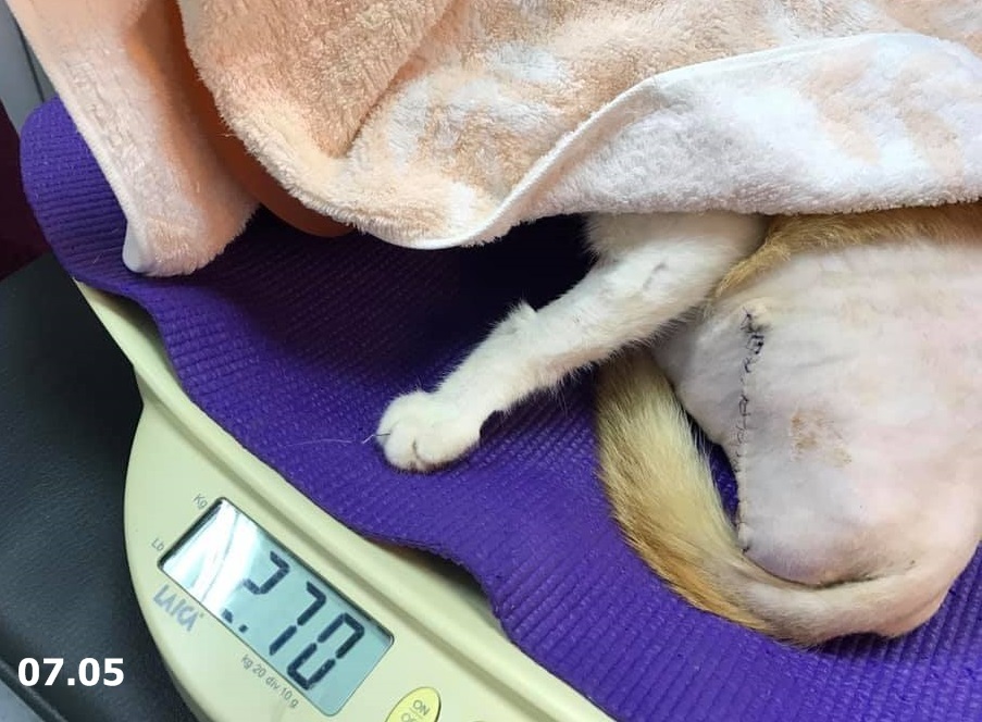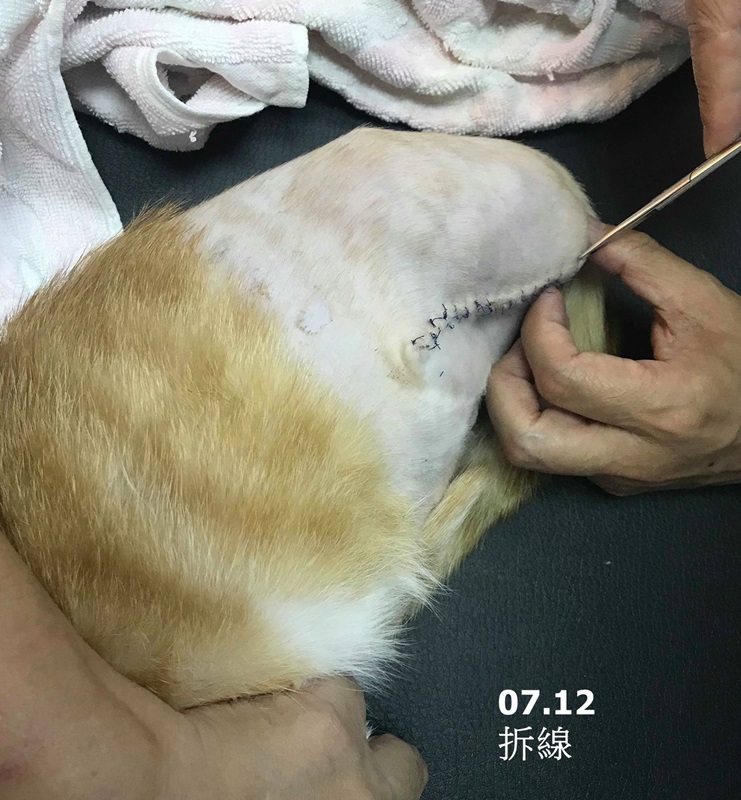 在大家用心照顧下小酒窩恢復情況良好,也漸漸的長胖些了,在7/5術後回診發現背部的兩個傷口有擴大,須要每天早晚清創及吃藥,7/12日回診全身上下各傷口狀況都不錯,已可將手術縫線拆除,經醫師評估後,小酒窩再休養幾日,於7/15日至亞太進行絕育手術。