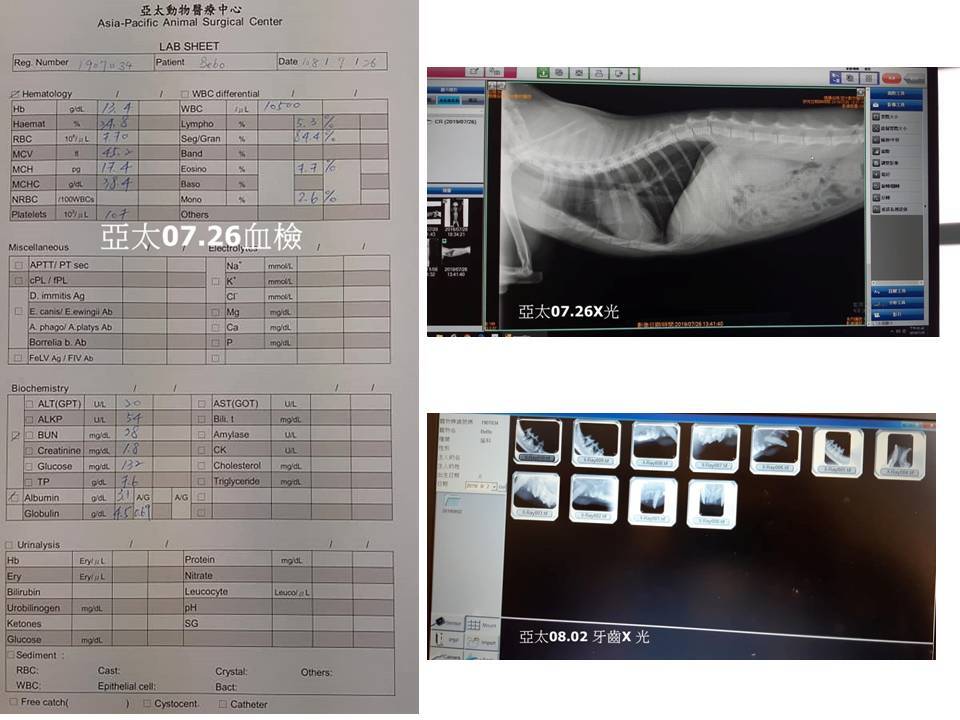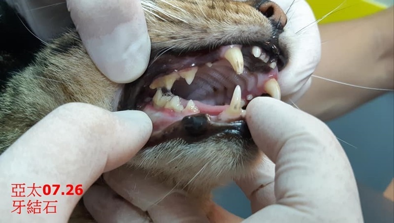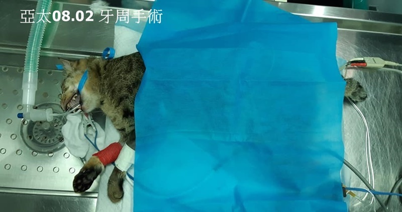 於是在極光內科回診檢查幾次後,協會再於7月26安排Bebo至亞太醫院請醫師檢查評估牙周手術,亞太醫師檢查後發現Bebo有牙結石,右下後牙齒有牙周病,左邊上方疑似齒再吸收疾病,安排於8月2日進行牙週手術,手術當日再仔細檢查,發現牙齒狀況比預期不好,因此一共拔除了14顆牙齒,手術十分順利,術後在醫院休息至清醒後,即帶回安養之家休養,8月9日的回診恢復非常良好。