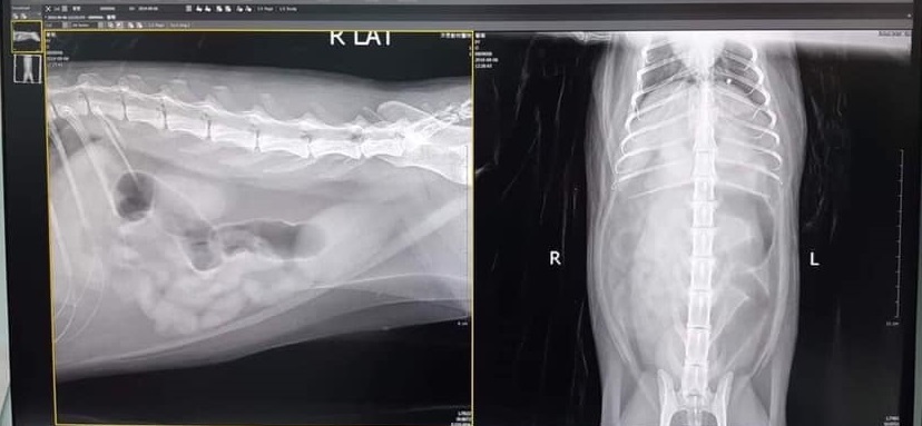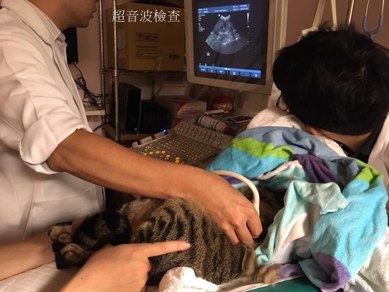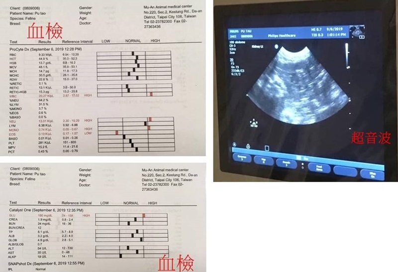 葡萄因多次嘔吐所以約診就醫,進行胰臟炎快篩,數據顯示並無發炎;血檢結果,唯白血球偏高且有些微脫水導致血糖偏高,其餘數值皆在正常範圍內。進行超音波檢查,腸胃也無異常,且胃部是整個空空的。