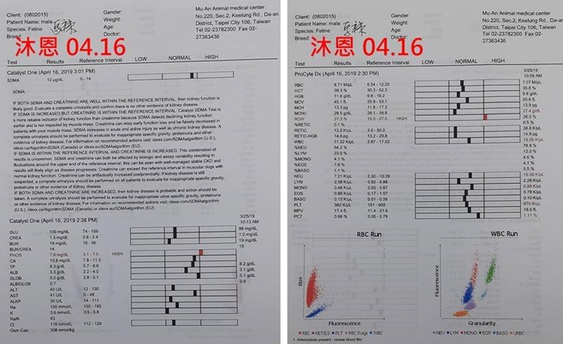 回報照護員觀察到馬辣水喝多、多尿後會再有些餘尿,林醫師以血檢結果診斷,認為仍是腎臟方面的問題,雖然腎指數很好,但磷過高,可能是腎臟的過濾功能有狀況,所以會喝多尿多及使磷代謝不出,故血檢加驗一項SDMA,是與腎臟代謝有關的指數,結果雖在正常值但有些略高。