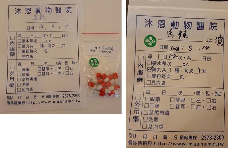 醫囑:為找出馬辣拉肚子原因,請先暫時不給任何保健品,例如腸寶、離胺酸等都先停餵,觀察一週後回報