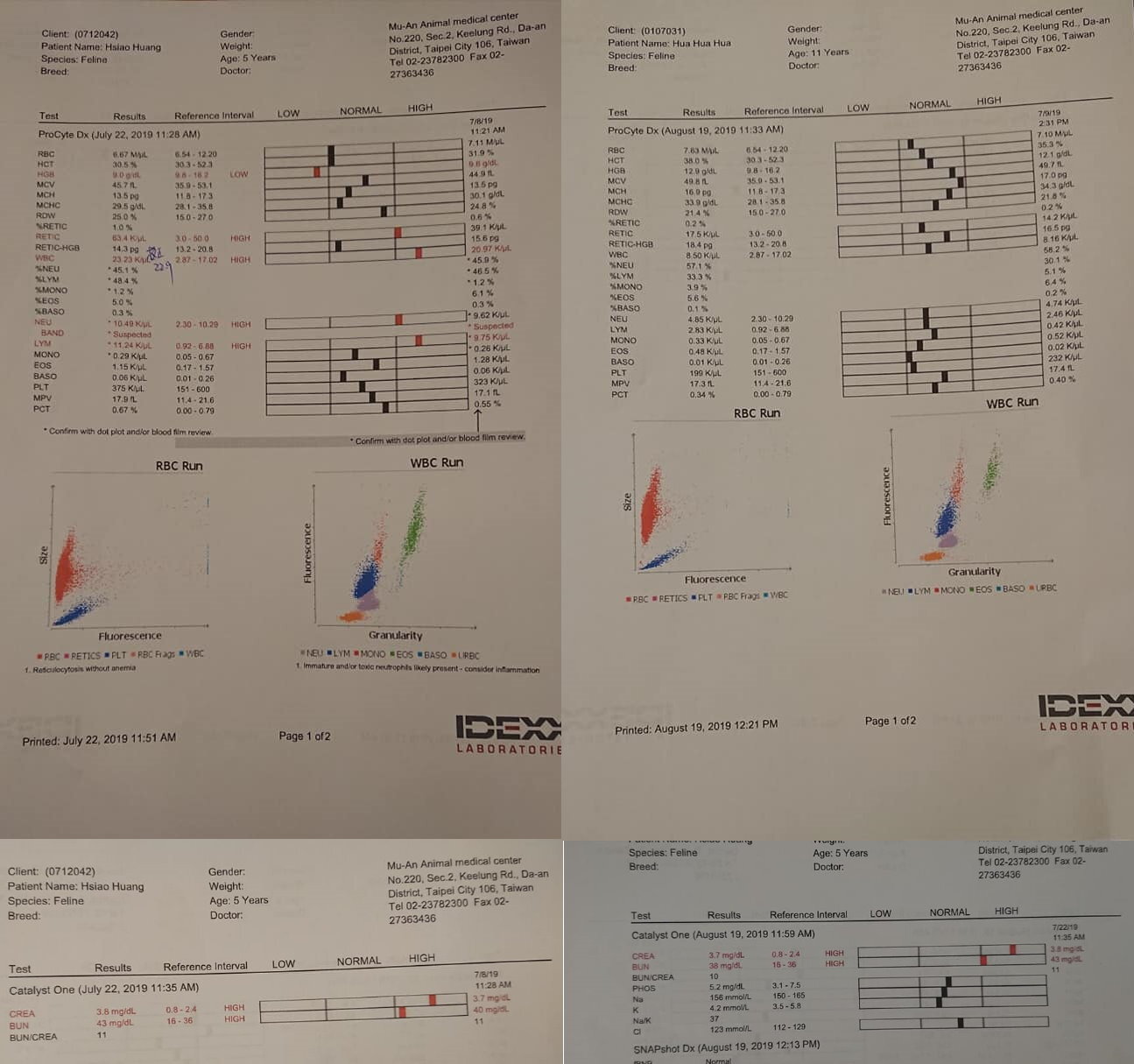 小黃便便狀況一直不是很穩定,有時幾天沒排便、有時連續幾天都泥便、水便,須要隨時調整用藥,如果小黃食慾降低,精神不好,甚至嚴重時嘔吐、泥便,還要增加皮下輸液,減少軟便劑的量,有時小黃久蹲無便須吃杜化液、腸蠕動劑看可否改善,如果持續排便困難,則需要麻醉浣腸,加上小黃腹部脂肪較厚無法徒手將糞便往後推,所以手術只能挖除靠近肛門口的積糞,無法一次全部挖出,只能持續皮下注射液,早晚皆吃軟便劑、3cc杜化液治療,等糞便往前時看是否能自行排出或者再次術挖除,每月複診腎指數緩緩上升,白血球、淋巴球、磷指數也偏高的現象,
