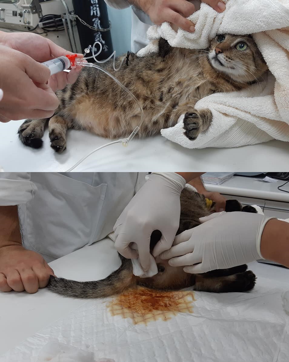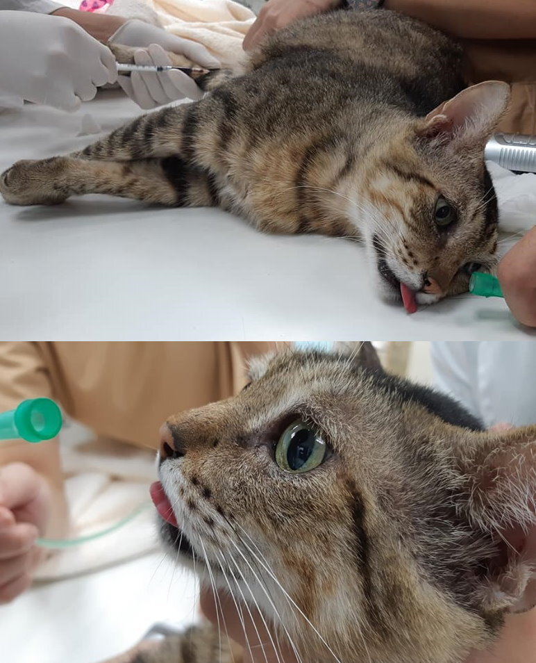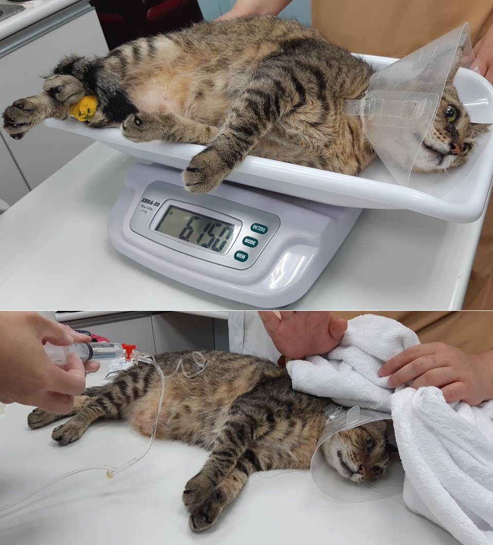 老虎肛門右邊再度破洞,醫師為老虎施打鎮定、吸氧,清潔傷口上優碘、打久安長效抗生素針,並因有禁食水而給予150ml乳酸林格皮下輸液,同時進行血檢。