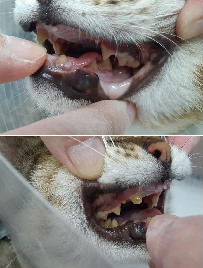 醫師同時檢查口腔,發現有中等程度牙結石、4顆犬牙都已斷,須留意進食情況、有無經常打噴嚏。