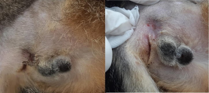 肛門右邊破洞有一小塊結痂,輕觸即掉,破洞已幾近癒合,周邊皮膚乾淨,再住籠、戴頭套五天,觀察無異狀即可取下頭套放風。