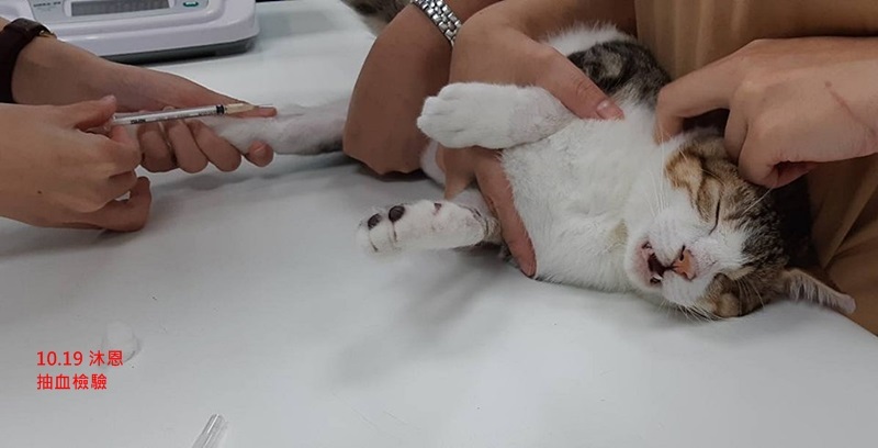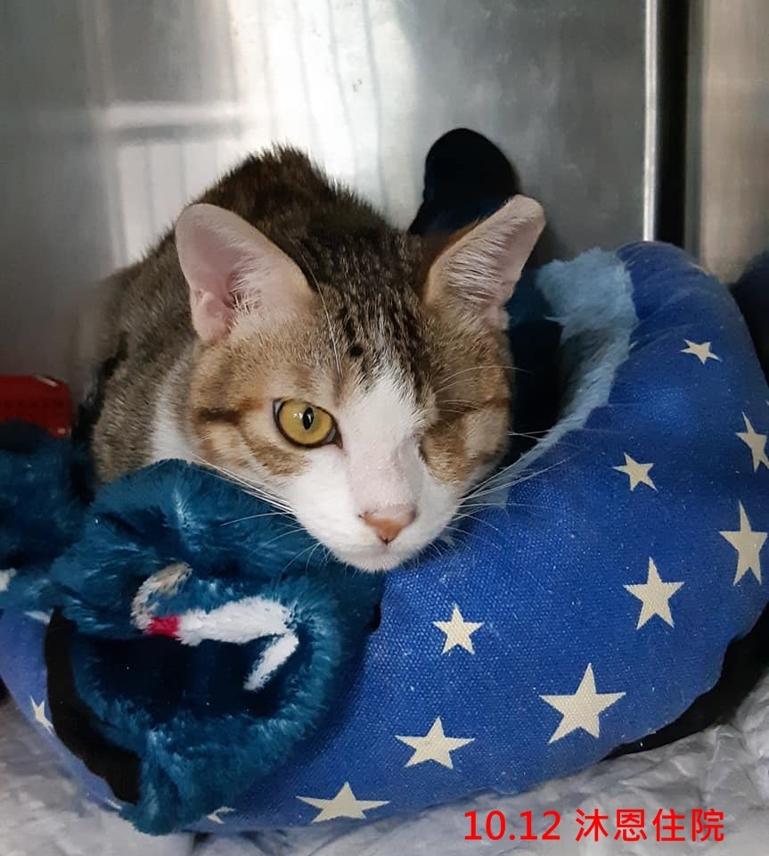 大尾因眼傷加上太過年幼,健康情況極不穩定,5月間因食慾不好、嘔吐至沐恩醫院看診,檢驗出腎指數偏高及貧血,兩度住院施打靜脈注射、吸氧,超音波檢查發現腎臟已受損傷,形狀較不完整,住院期間還因紅血球指數下滑須要輸血,大尾須每日吃降磷藥、打皮下輸液,因有貧血,須隔幾日便施打造血針,定期回診檢查以調整用藥。