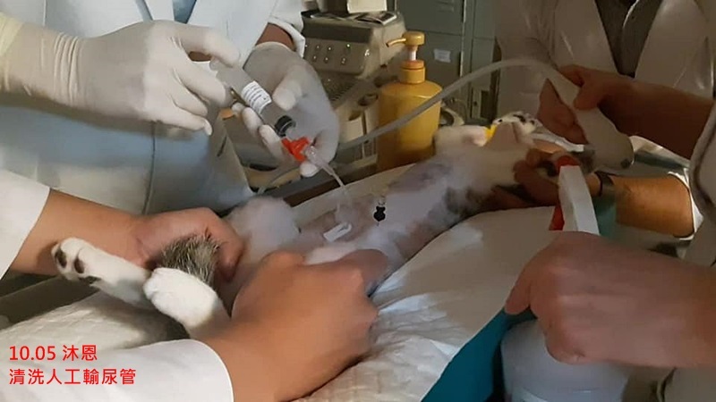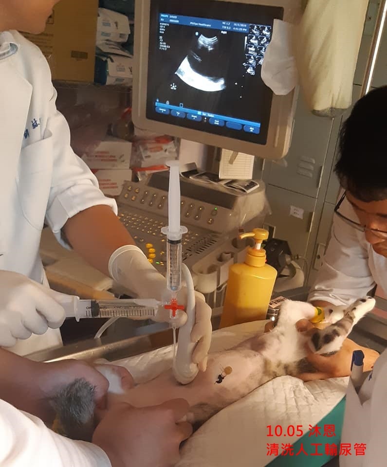 另之前腎臟採樣送美國檢驗的結果顯示,大尾應是先天性的腎臟異常,看來接近第四期腎病,先前有發生腎盂擴張,可能因感染造成腎盂腎炎而阻塞,但在數次的尿液培養並沒有結果,今天由林院長為大尾沖洗人工輸尿管,再採尿進行培養,今沖洗出來的液體乾淨,之後會由武醫師進行,時間再通知。