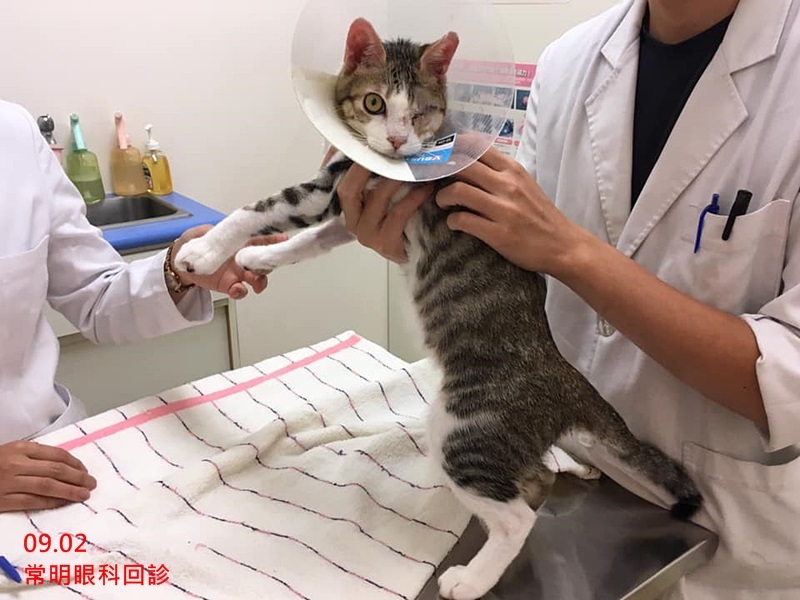 而大尾受傷的左眼,在5月至7月間持續於眼專科常明醫院看診,醫師確診大尾的左眼已無法復原必須摘除,經沐恩內科醫師評估許可,於8月26日至常明醫院進行了眼球摘除手術,又因大尾已屆可紮年紀,為避免多一次麻醉傷及健康,眼球摘除手術同時進行了絕育,9月2日回診常明術後檢查。