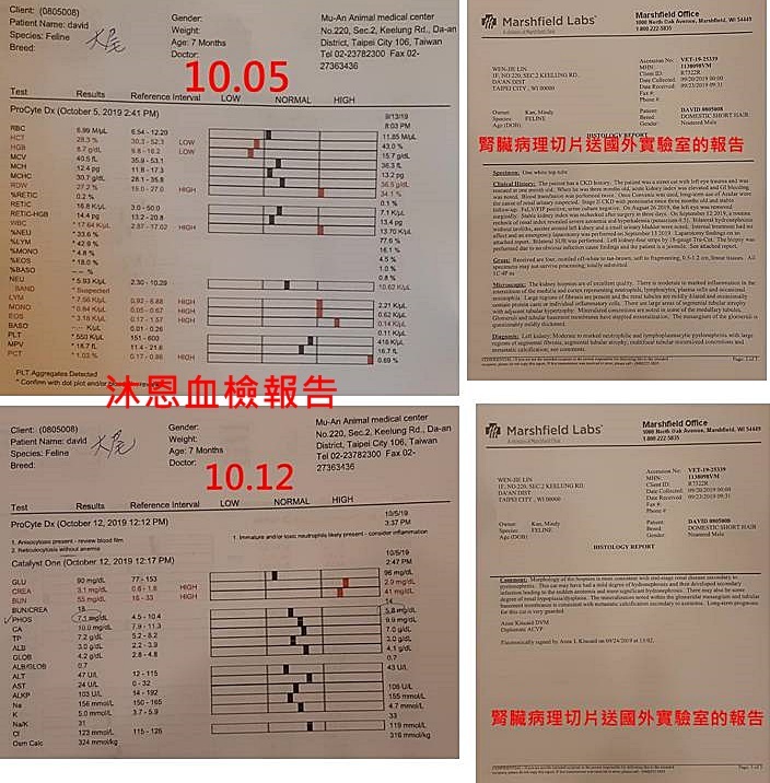 9月12日大尾突然頻繁嘔吐,工作人員立即帶至沐恩醫院,醫師進行胰臟炎快篩是陰性,但血檢結果cre飆高到9.4、bun到130,鉀離子8.5,腎臟部份兩邊都有水腎,左腎的邊也有點腹水,懷疑是腎發炎造成,先上靜脈點滴,但因醫師建議需要24小時照護,所以當晚便將大尾轉至台大醫院。