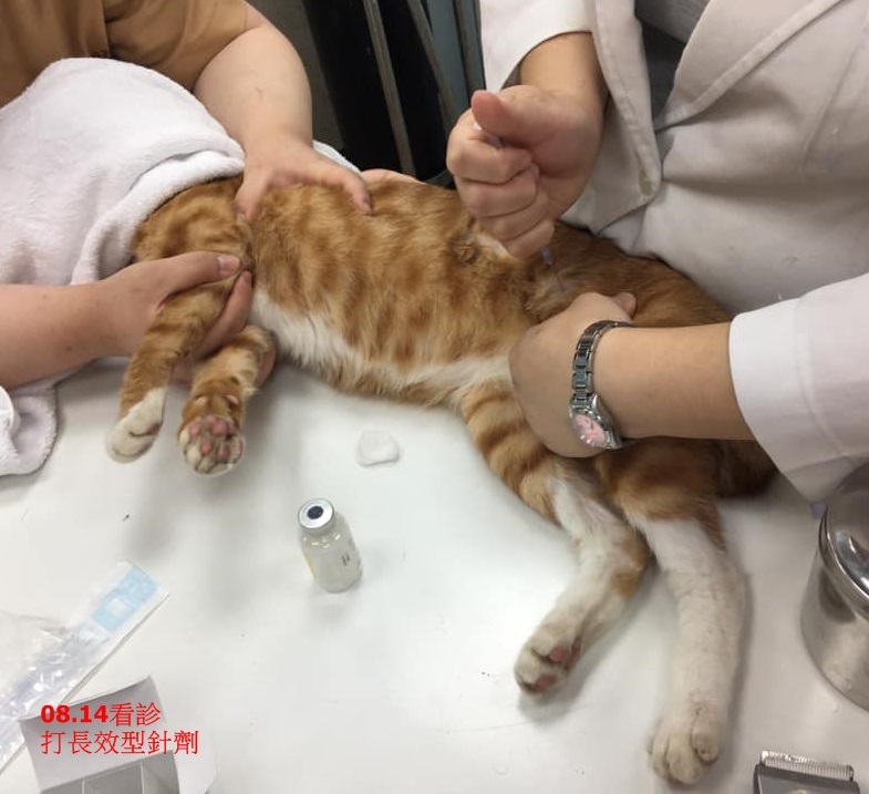 左眼上的新傷口有做刷洗,頸部的皮膚雖已癒合,但還是有些紅紅的,腹部毛髮下的皮膚並沒有紅腫,因抗生素時效關係,所以今日在院內再次施打長效型針劑,抗生數皮下注射、類固醇肌肉注射。