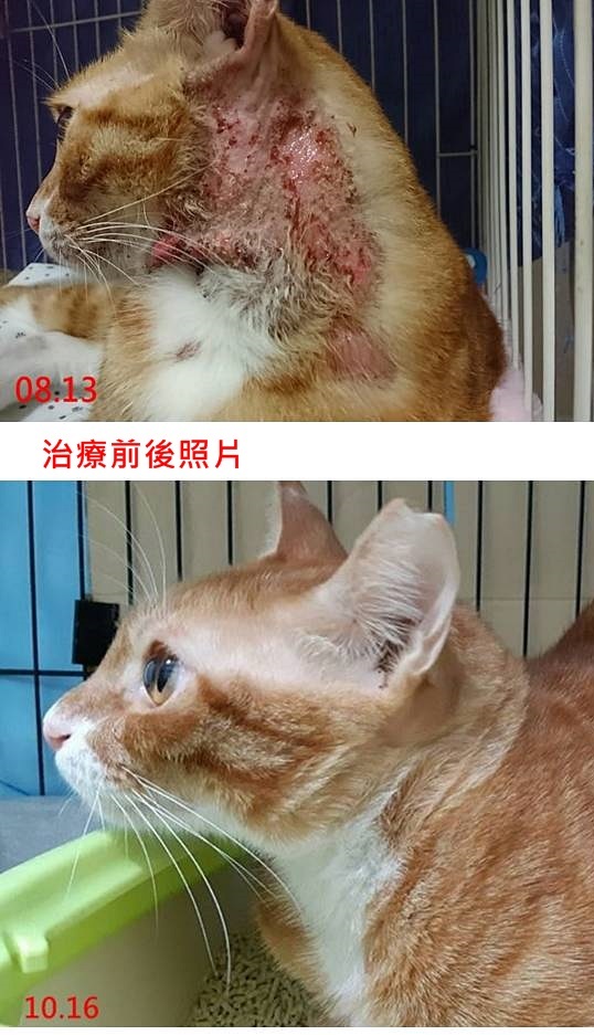 歷經月餘的用藥及仔細的選擇調整食物減低過敏因素,短短的傷口復原良好,已完全看不出紅腫痕跡,9月初向醫師回報,已可不須再吃藥及回診,短短便再回到熟悉的苗栗安養之家,和他的好朋友們相聚,目前精神食慾都正常、先前的患處也長回了漂亮的毛。