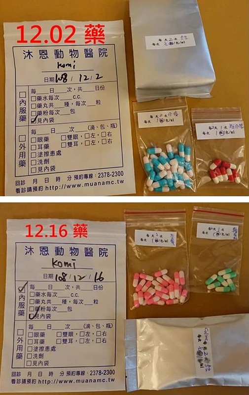 Callme每天除了依照醫師囑咐的醫療用藥,照護員也會給她吃離安酸保健、早晚噴氣霧、洗臉、擦鼻子點眼藥,還買抽取鼻涕的機器,在她鼻濃嚴重時幫她抽鼻涕,淚眼鼻膿情況有漸改善,但因先前呼吸道病毒感染太嚴重,有時天氣變化又會變得較為嚴重,目前仍需持續回診, Callme的醫療會是終身的需求,累積的醫藥費不少,本筆醫助是2019年12月2日、12月16日至沐恩醫院回診的醫療費用,包含血檢、用藥,請大家一起幫忙可愛的callme,謝謝大家。