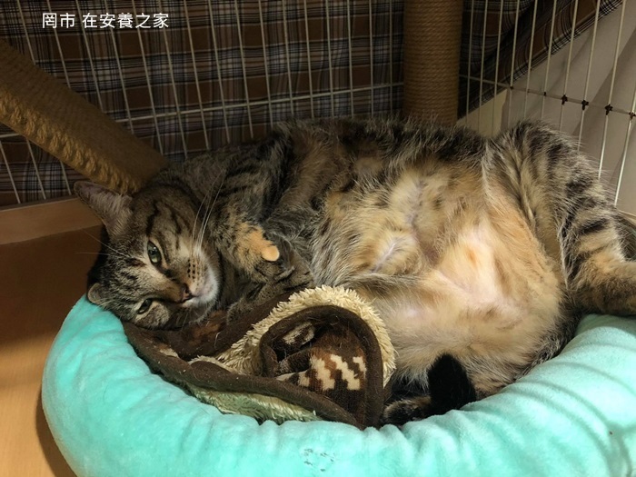 在安養之家的罔市,每天按時服藥,照護員早晚都要測量記錄她的心跳呼吸,以確定罔市情況的穩定,目前她的情況控制得很好,罔市的個性非常親人撒嬌,有時為她測量心跳都只聽到好大的呼嚕聲,也常翻肚肚腳開開的討摸摸,大家都好疼愛她,希望可愛的罔市永遠健康平安。