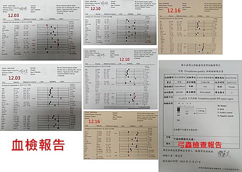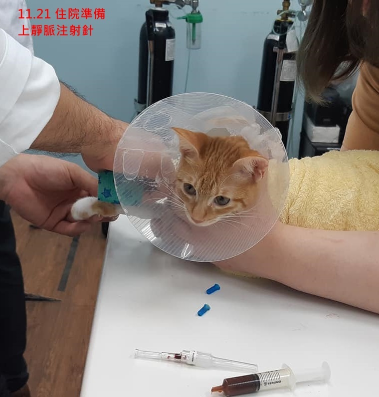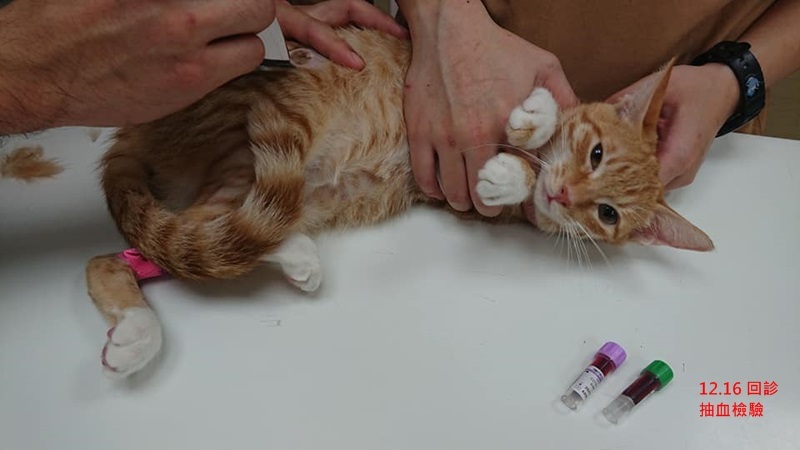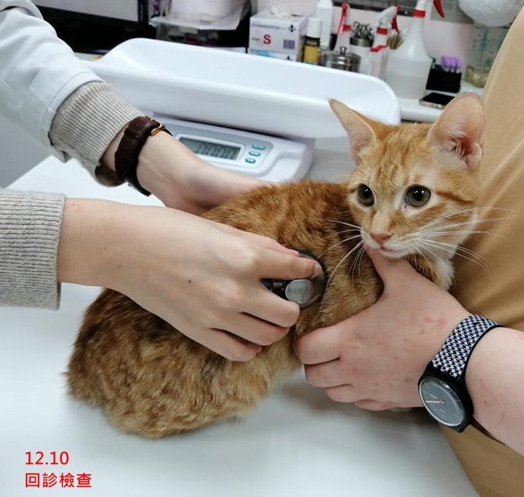 7月5日進行超音波、血檢,白血球2萬4、脫水、貧血,醫師認為尚不足以確診為腹膜炎,但須先住院施以靜脈注射,隔日將採樣送冠狀病毒檢驗、腹水的分析、細菌培養,收到報告後確定為腹膜炎,除了仍須持續靜脈注射,並開始施打干擾素。