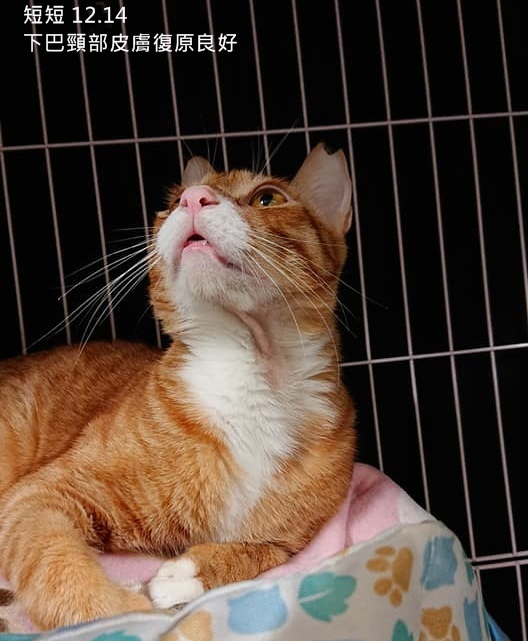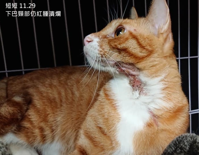 但11月短短又再出現相同的頸部皮膚紅腫潰爛,經詢問沐恩醫院,因考量短短很緊張的個性,為減少看診的緊迫感,先採取給藥方式,將口服藥物混在罐罐給短短服用,如果服用一段時間未見改善便仍須安排回診。