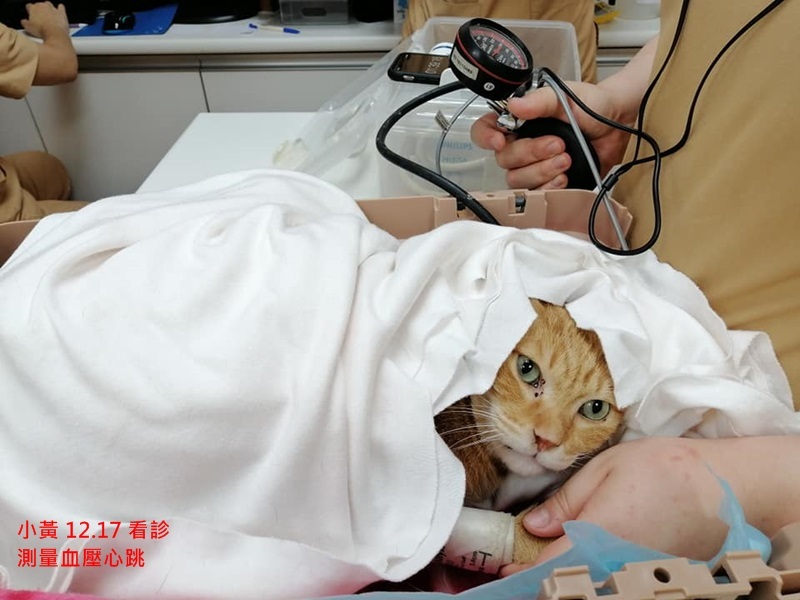小黃因非常瘦弱,住院觀察了幾天才進行手術將腫瘤取出,但因腫瘤過大,無奈需一併截肢,先前的流浪生活及腫瘤讓小黃的健康情況很不好,腸道結構改變、大腸太粗、有巨結腸,致大便容易累積排不出,所以小黃需要長期吃軟便劑等藥物以幫助排便。