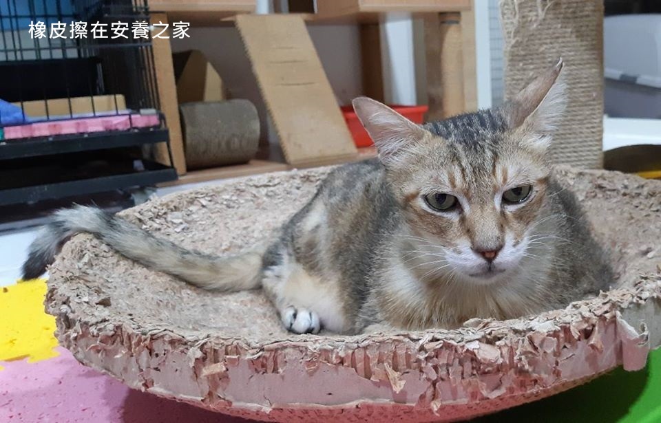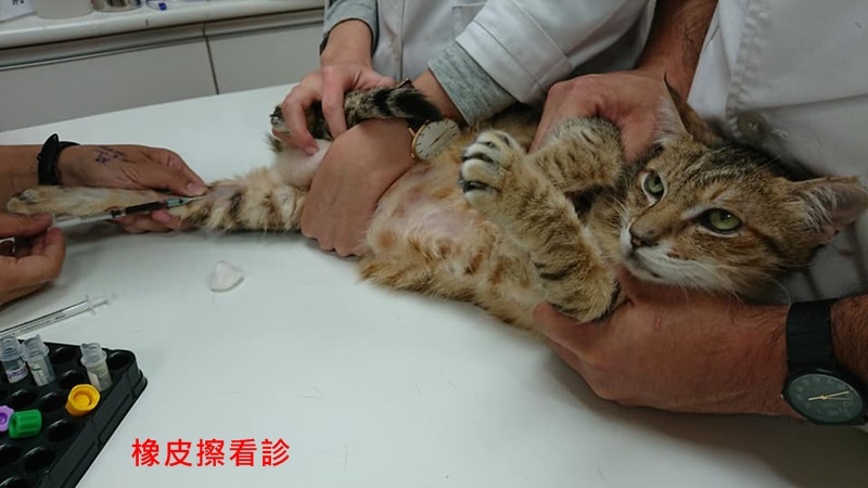 橡皮擦是協會在2014年4月中旬救援的貓咪,當時有民眾向協會通報,發現一隻貓咪的腹部束著橡皮筋,有一圈嚴重的傷口,協會誘捕後送醫,醫生判斷橡皮擦在約2~3個月大時,腹部就已被被套上了兩條橡皮筋,隨著長大,橡皮筋越勒越緊,不只造成外部傷口,也使膀胱移位,更導致部分器官無法正常長大、後腿肌肉發育不全、血檢後發現是愛滋帶原貓咪。