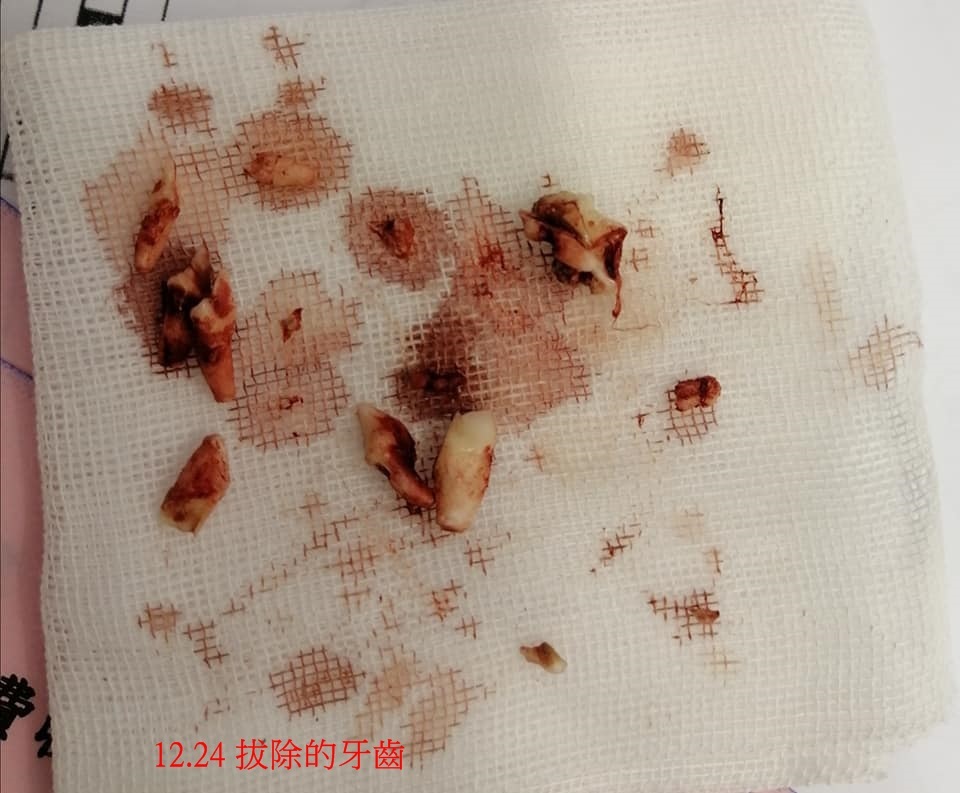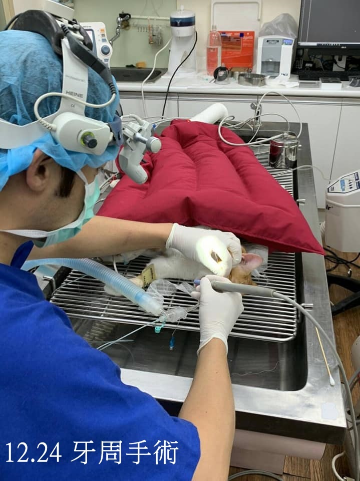 今進行牙周手術,口腔後方有較嚴重的齒吸收疾病,共拔除8顆牙齒 、一個殘留牙根,因哈哈對氣麻有點過敏反應,術中血壓一度較低,醫師加入液麻, 因此甦醒較慢。