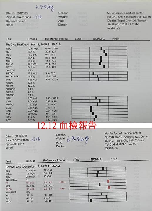 血檢結果,紅白血球、肝腎指數皆正常,但發炎指數偏高;口腔檢查,牙齒狀況很差,須進行牙周手術,為減少感染風險,術前先給予一週抗生素,因哈哈個性很緊張,選擇二天一次的打針方式。