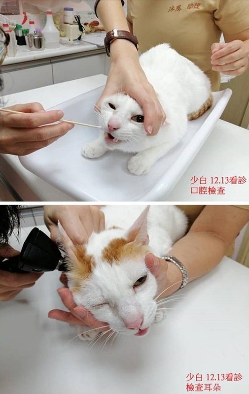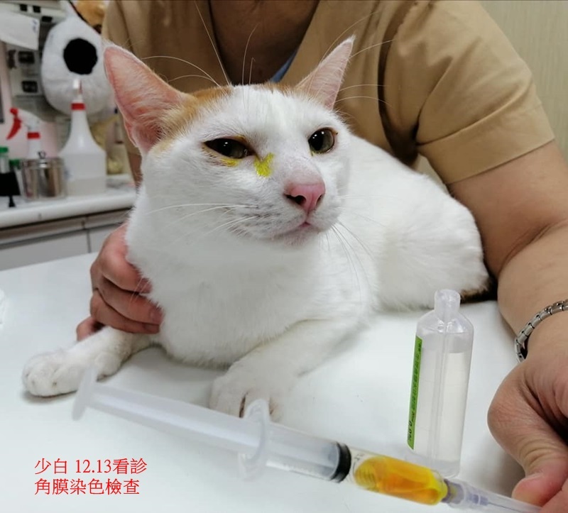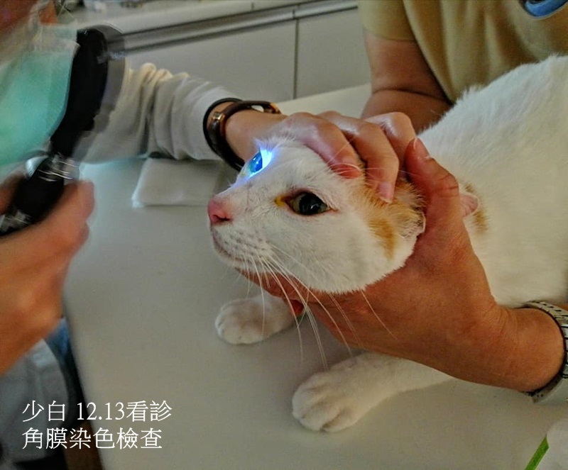 住在大湖安養之家的少白,每天開心活潑的玩耍嬉鬧,活力旺盛,但可能近日天氣轉變的影響,12月時突然右眼淚眼汪汪又紅腫,因此工作人員前往帶回台北沐恩醫院治療,醫師進行角膜染色檢查,幸好沒有傷口,應是上呼吸道病毒引發感染,先以點眼藥水方式治療及觀察即可。