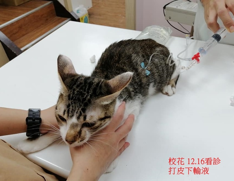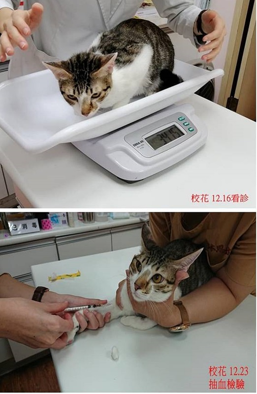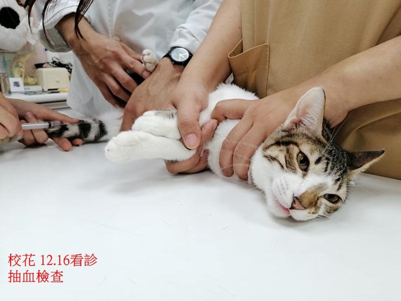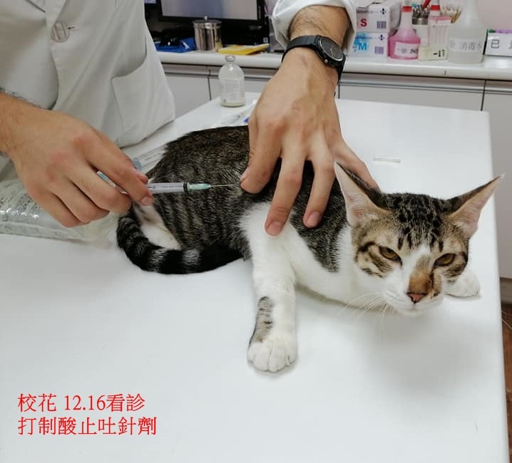 12月中照護員發現校花精神食慾都變差,有嘔吐,12月16日帶至沐恩醫院進行檢查,有輕微發燒,血檢胰臟炎是陰性,紅血球偏低,抹片檢查白血球有發炎情形、,便便有點泥狀,研判可能是腸胃炎,現場先打皮下輸液避免脫水即打制酸止吐針劑,開口服抗生素及胃藥每日服用並打輸液,囑咐再多觀察,12月23日回診追蹤血檢,血檢結果指數都有進步,但因嗜酸性球的比例較高,有寄生蟲的可能性,整體健康情況有變好,只要再吃一周藥即可。