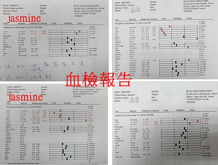 血檢結果腎指數大致持平(crea3.6-->3.4,bun41-->46),但紅血球指數HCT21.4下降(11/26是35)醫師說明,腎貓造血功能較差,所以紅血球的指數會較為不穩定,以jasmine的情況看起來,不大像是消化道的問題,但還是請仔細觀察尿尿便便顏色,如有異常請立即回報,先打回造血針,兩週後再看指數有無進步。