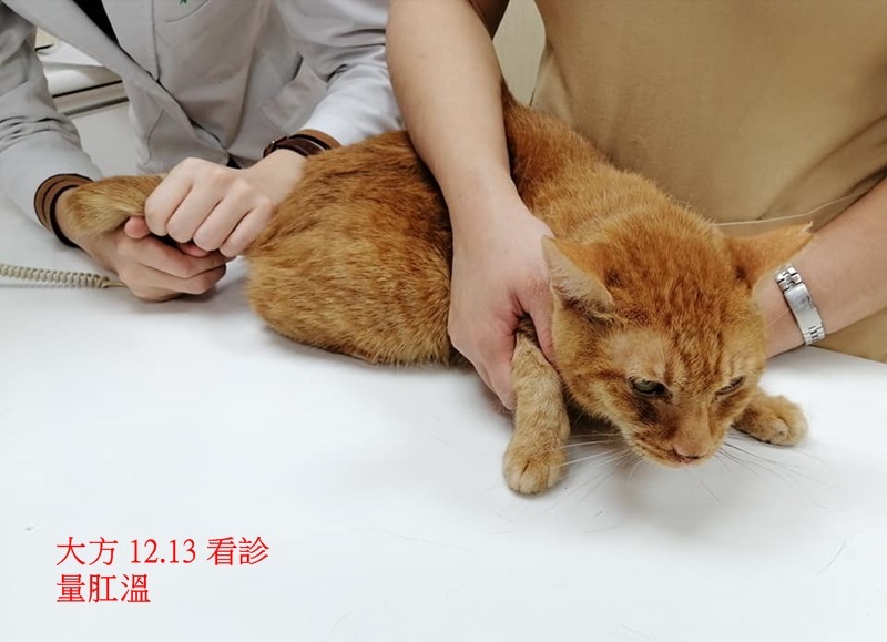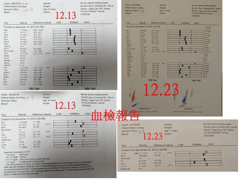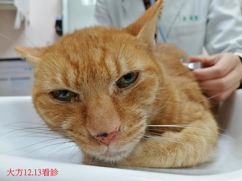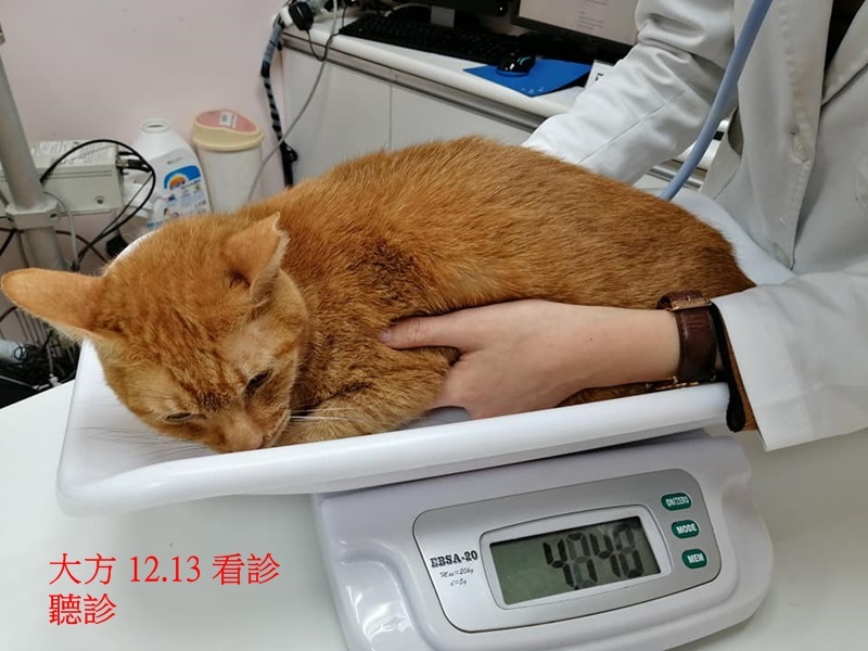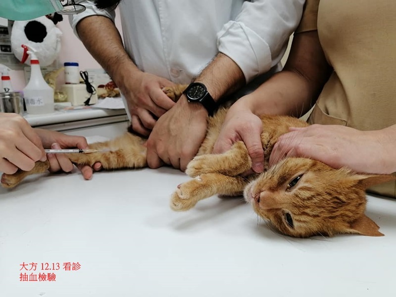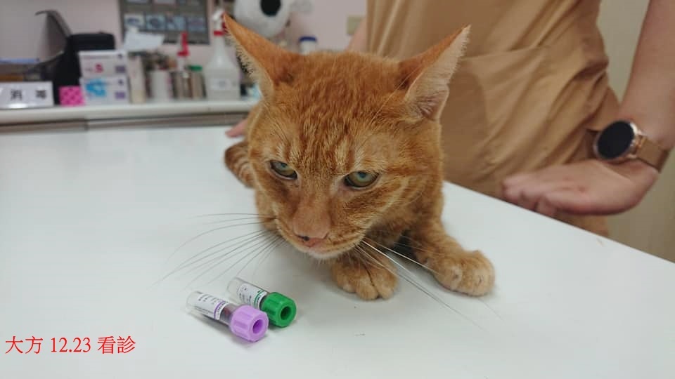 今年12月大方精神不佳無食慾,接回台北於12月13日約診沐恩醫院,血檢結果,發炎指數腎指數都升高、加上口腔檢查發現牙齦很紅腫,診斷為嚴重牙齦炎,可能是牙齦炎影響到腎臟指數,須進行牙周手術,等待手術期間,除了吃藥還須每日打皮下輸液,原本預定12月31日藥進行牙周手術,但在12月23日大方突然嘔吐於是提前回診,血檢結果腎指數跟白血球指數都升高了,研判可能是腎指數升高或是服用抗生素引起的腸胃問題,在牙周術前須先再服用腸胃用藥,待手術當日再追蹤檢查加以評估。