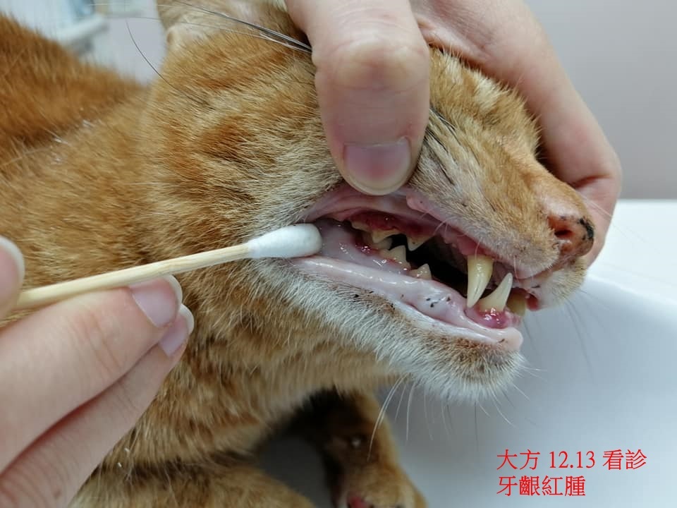 口腔檢查,口腔後方紅腫,是嚴重牙齦發炎並非口炎,齒況不佳,口腔部份的淋巴結有腫大。