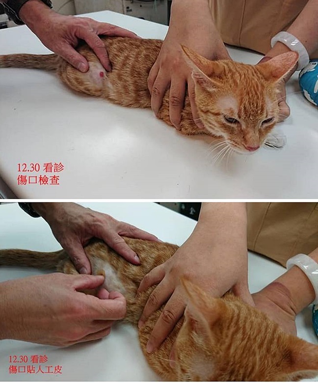 醫師檢視傷口,認為已快痊癒,日後護理更換人工皮之前先做簡單的清潔,以食鹽水清潔擦拭傷口後,擦乾再貼上人工皮。
