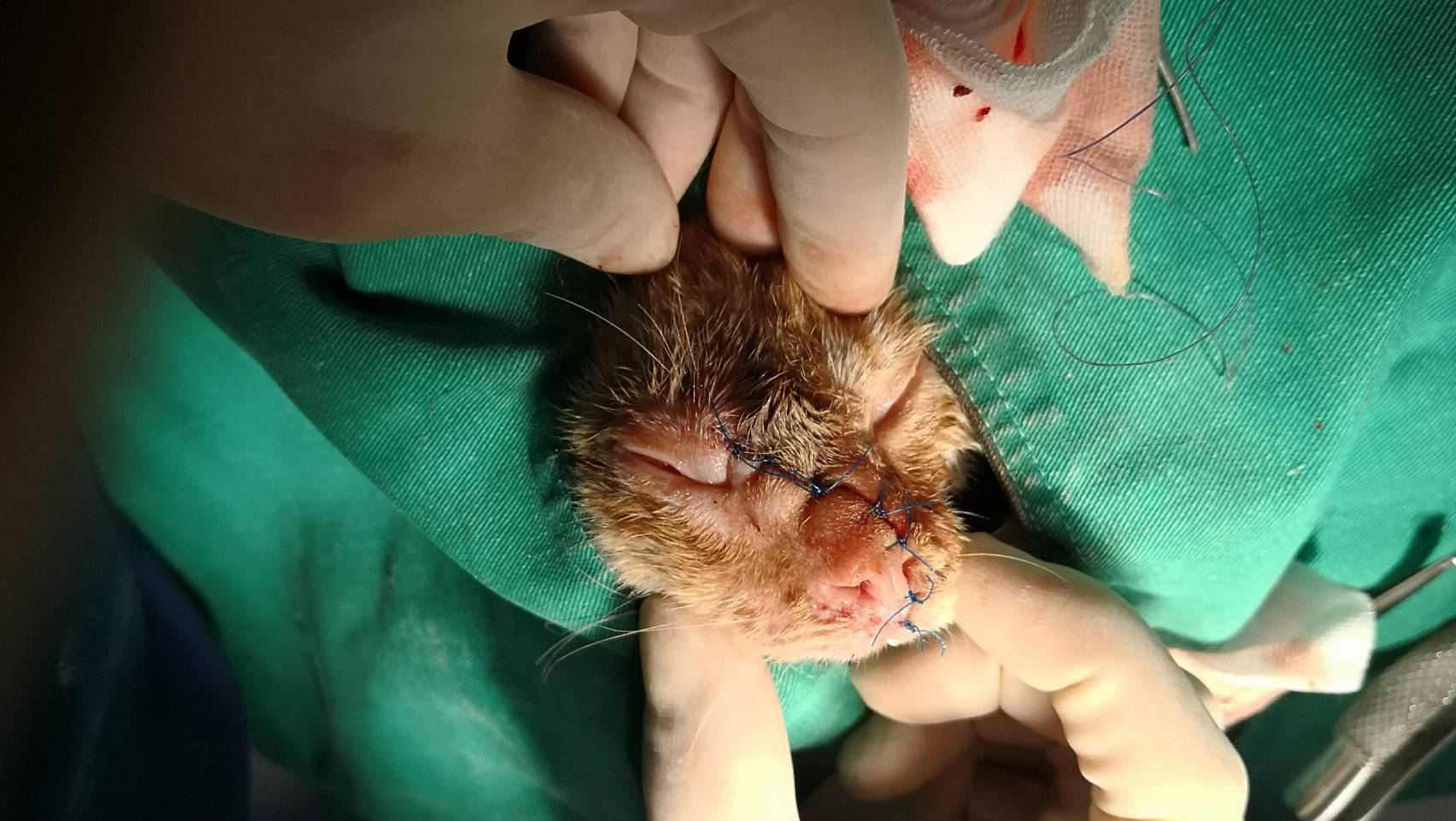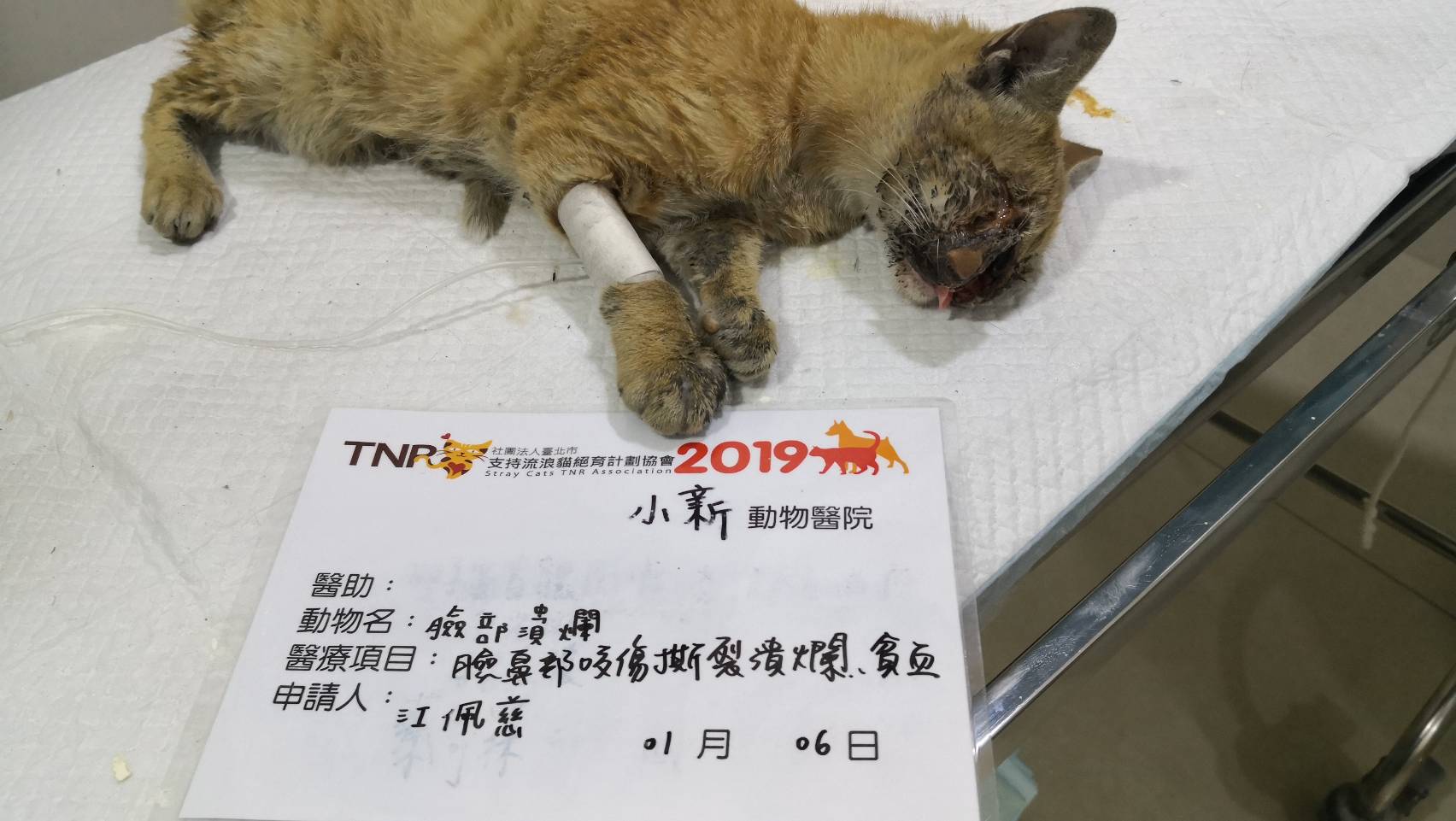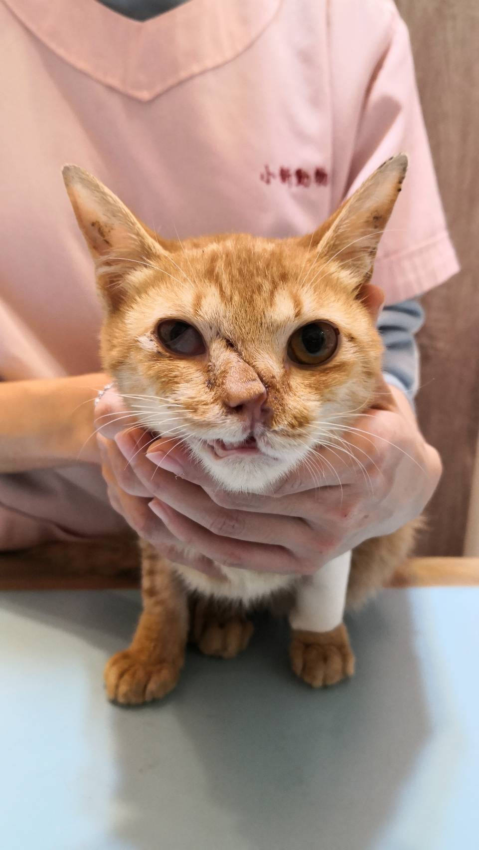 主題: 仁武右臉潰爛小橘 申請者姓名: 江珮慈 花色: 申請日期: 2020-02-02 23:29:33 申請者部落格: 申請者臉書網址: https://www.facebook.com/profile.php?id=100000883596885 所在縣市/合作醫院: 高雄市/小新動物醫院 治療費用: 27600元 需求人數: 60人 已結案 (2024-05-31 18:21:18) 報名人員: 彎彎 x3(已付款)、李吱吱(已付款)、蔡茶茶(已付款)、LARA(已付款)、DT x2(已付款)、Amanda Cho(已付款)、wandy x2(已付款)、王員外的爹 x2(已付款)、阿雪(已付款)、Yalin Chen(已付款)、佳佳 x4(已付款)、阿嘎(已付款)、阿嘎(已付款)、May、加菲(已付款)、鳳鳳(已付款)、Kenvy(已付款)、祐子(已付款)、Rico(已付款)、Irene Hu(已付款)、響林椰貓(已付款)、平(已付款)、Chi、Elie x2(已付款)、吳姐 x4(已付款)、馨*(已付款)、Elaine Lin x2(已付款)、Lian Kim(已付款)、熊、笨貓與妞妞(已付款)、捲捲米花(已付款)、Nana(已付款)、Peipei(已付款)、evelyn.lin66 x2(已付款)、寇妮妮(已付款)、小P(已付款)、小P(已付款)、Amanda Sun x2(已付款)、李詩詩(已付款)、Arvan Huang x2(已付款)、Alissa Lin(已付款)、kaki(已付款)、翎翎(已付款)、蔡宜靜(已付款)、carol chang(已付款)、martim(已付款)、snoopypeggy(已付款)、 候補人員: 動物病情說明: 餵食小橘貓時,發現牠半臉幾乎受傷潰爛,右眼受傷可能有失明之虞。後來成功誘捕送至小新動物醫院後,醫生診斷出貓咪鼻中隔跟鼻頰骨碎裂,上顎嚴重撕裂。由於傷口切割面平整,研判可能是被利器所傷,排除掉被狗咬傷的可能性。所幸的是,貓咪右眼眼球並沒有受傷,只是因為離傷口很近,稍有發炎現象。眼睛四周肌肉也有被拉扯到,所以感覺不是很自然。此外,因為貓咪受傷時間過久,未即時治療,很多組織都潰爛壞死,只能盡量將壞死潰爛的地方清理乾淨,然後重建鼻骨、上顎還有皮膚。隨後也檢驗出貓咪貧血嚴重,有開補血劑。至於愛滋白血是陰性,其他肝腎指數也都正常。治療期間,貓咪生存意志始終強烈,食慾非常好。不過過年前,貓咪突然出現吐跟拉的狀況,食慾明顯變差。為以防萬一,醫生決定檢驗是否染上貓瘟,所幸檢驗出是陰性,只能暫時先實施打針、吃藥及打點滴,看看貓咪後續狀況是否變好。直到過年後,貓咪已恢復食慾,不再吐跟拉,終於到了可接回貓咪的時候了。 動物近況說明: 貓咪離院前,醫生有交代說到,因為貓咪眼、口、鼻都有受傷過,所以後續照顧會比較費心。除了持續幫牠點眼藥水,保持眼球濕潤外,往後貓咪的呼吸道也較易出狀況,有可能必須長期靠藥物來控制。雖說貓咪從此不再像受傷前那樣健康,但是還是很高興因為這個救助的機緣,讓可憐的小橘貓不再流浪街頭,未來貓生有人疼愛照顧,過著幸福平安的好日子。