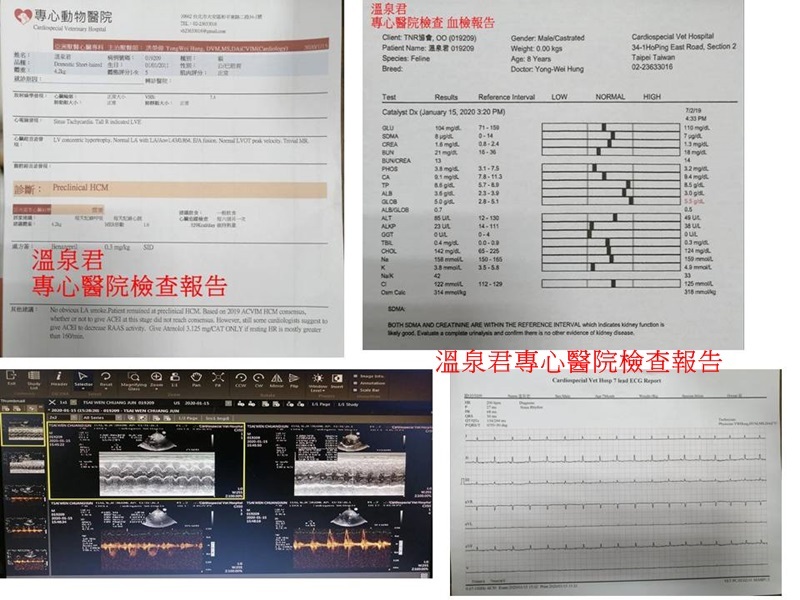 溫泉君的心臟疾病,須要半年定期至心臟專科檢查進行心臟超音波、血壓監測,持續服用心臟病藥物控制,所以每個月都要至醫院取藥,本筆醫助為1月13日至極光醫院取一個月份用藥及1月15日至專心醫院回診檢查心臟的費用,包含心臟超音波及X光、血檢,希望大家一起幫忙可愛的溫泉君,謝謝大家。