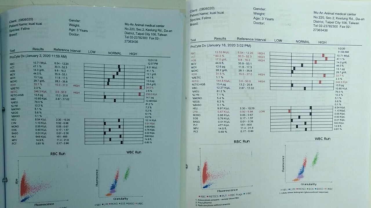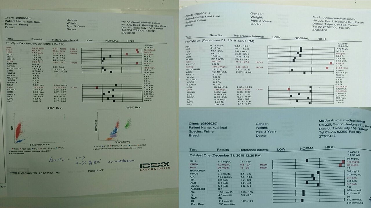 血檢結果,血糖升高一些,因乖乖看起來不緊張,就可能是類固醇的影響,腎指數crea5.7-->5.2,bun86-->80,紅血球相關指數都仍偏高,整體結果大致持平,加上臨床症狀良好,因此今開始降類固醇劑量,其餘用藥照舊。