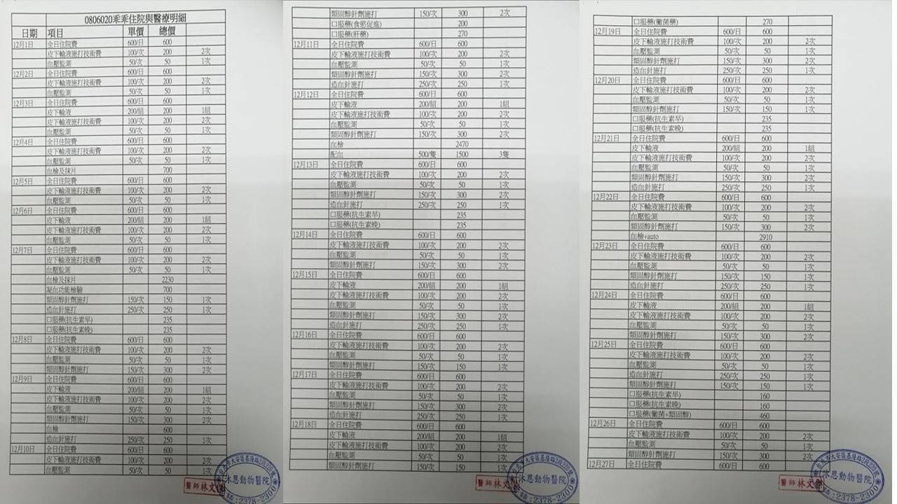 8. 皮下點滴:乳酸林格,一天兩次,每次200ml,分左右兩側施打動物近況說明: 乖乖住院期間比出院期間久,醫院對他來說比在協會還自在,回到協會後,乖乖的食慾與精神比較沒這麼好,大多時間是窩在自己的籠子裡,至於回到協會時常嘔吐的情況,也有在這次回診詢問醫生,定時定量比照醫院,若頻率太過頻繁,即放食時先不給飲水。