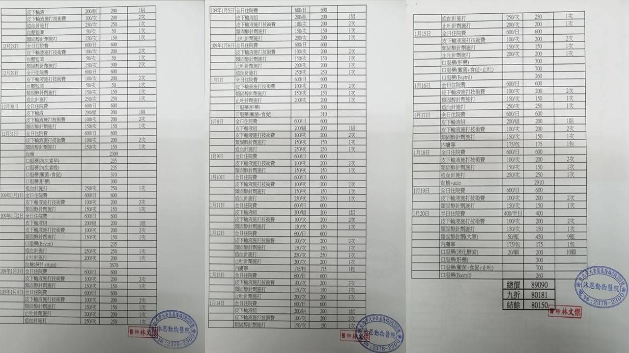 止吐針,抗生素、類固醇、皮下輸液、血壓監測,指數穩定後開始口服黴菌藥、肝藥,並服用魚油增加長毛的速度。