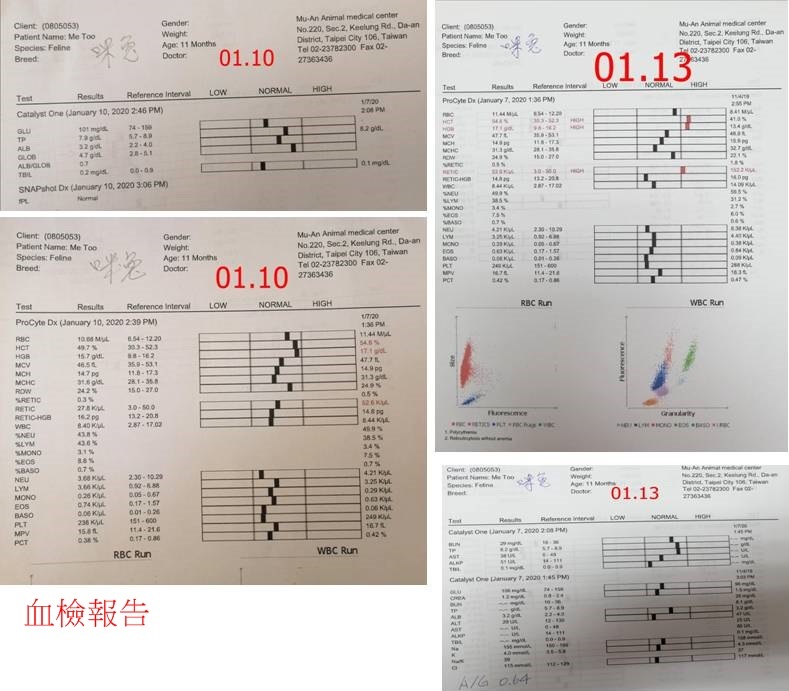 咪兔昨晚至今早幾次嘔吐,血檢結果,AG比0.64,紅血球指數RBC11. 44,HCT54.6 高於正常值(30.3∼52.3) ,白血球、肝腎、離子都正常,觸診聽診沒有發現異常。