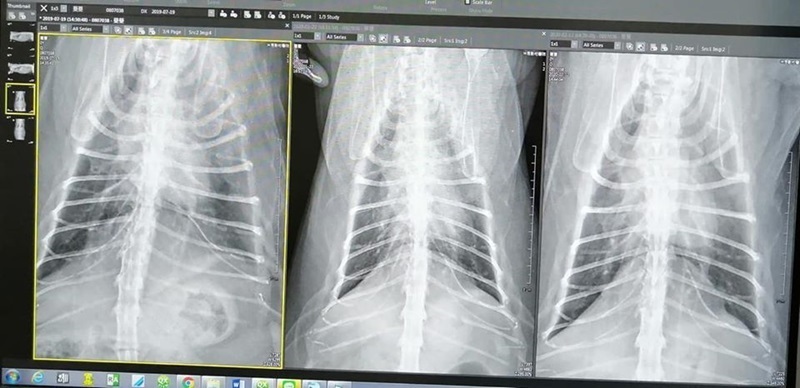 X光檢查發現肺部異常,出現有慢性胸膜炎,也就是肺的外部發炎,看來已有段時間了,可能原因有自體免疫性問題、環境空氣、肺部分泌物等,先以氣霧二週治療。
