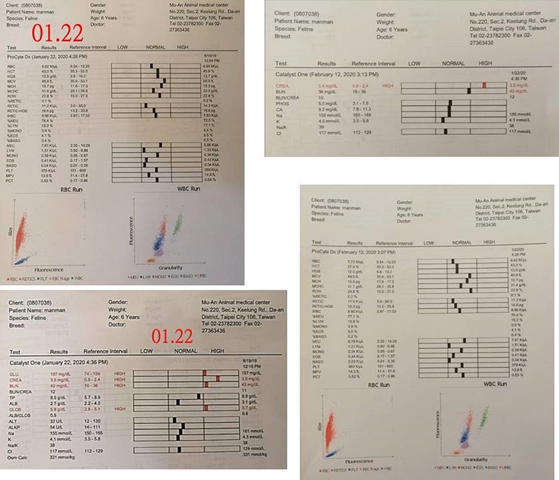 蔓蔓在2020年初,因幾日無便,擔心與腎病有關,約診沐恩醫院,血檢沒有太多問題但是X光發現肺部有些發炎,因腸道無發現積便,因此幾日無便是因為進食不佳,醫師開了食慾促進劑,及囑咐每日氣霧,三周後再回診,無發現異常變化,但因體重已增加,表示恢復情況不錯,可不須回診但須觀察體重食慾變化。
