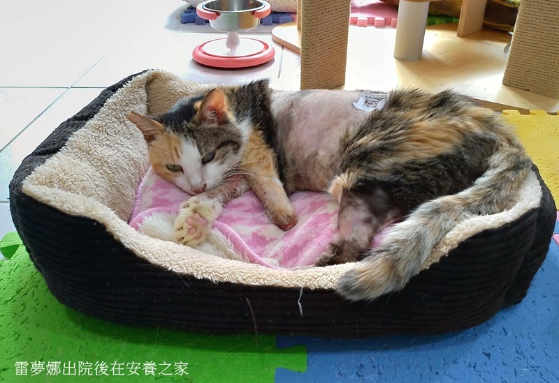 雷夢娜來到協會多年,受到無微不至的呵護,她的個性非常溫柔親人,工作人員都很疼愛她,看著她辛苦的醫療過程,讓人很心疼,讓重症貓咪過著有品質的舒適生活,是協會一直以來所注重的,擔心雷夢娜住院那麼久會想家,想讓她能舒服開心的過著每一天,於是在2月26日請醫師為雷夢娜貼嗎啡貼片,減輕她的疼痛不適,再辦理出院帶她回家,照護員為雷夢娜準備很安全舒適的睡窩,雷夢娜看到熟悉的環境與貓咪室友,眼神都亮起來了,還會喵喵叫的對照護員說話,雷夢娜回到家真的很開心。