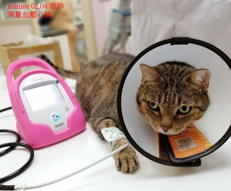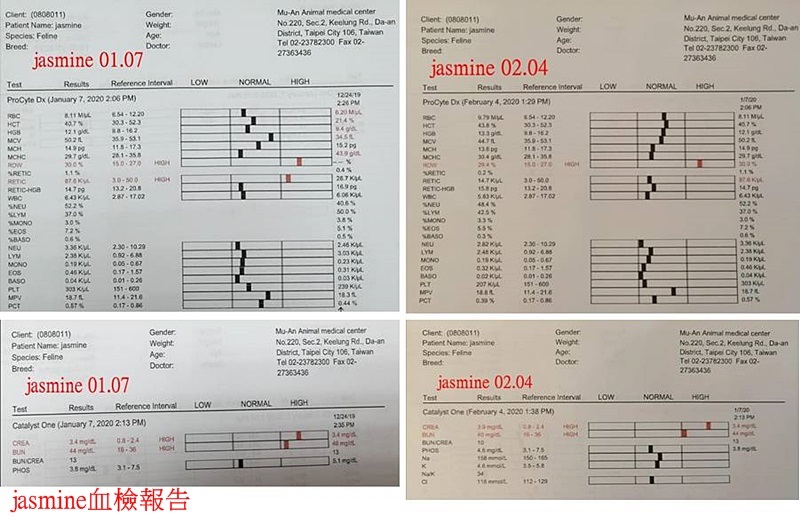 血檢結果,腎指數稍微升高(crea3.4-->3.9,bun44-->40) ,紅血球指數再上升(40.7-->43.8,正常值是30.3∼52.3),血壓150、心跳206,略高,醫師認為可能與jasmine 看診時心情不好有關。