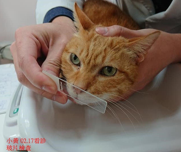 小黃是協會在103年救援的貓咪,原本生活在台南,有某戶好心人家餵食,一日發現小黃的前肢長了一顆腫瘤,幾個月下來腫瘤越來越大,這戶人家無法捉到小黃帶他就醫,於是向外求助,志工們自台北去到台南誘捕到小黃並送往重症醫院治療。