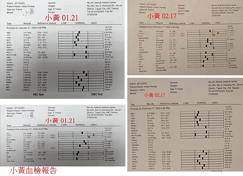 今日血檢,先前可能較緊張使淋巴球較高,今天指數正常,腎指數crea3.4持平,bun36-->41及磷指數5.8-->6.4,都升高,可能是罐罐吃較多,醫師認為今天血檢結果持平穩定。